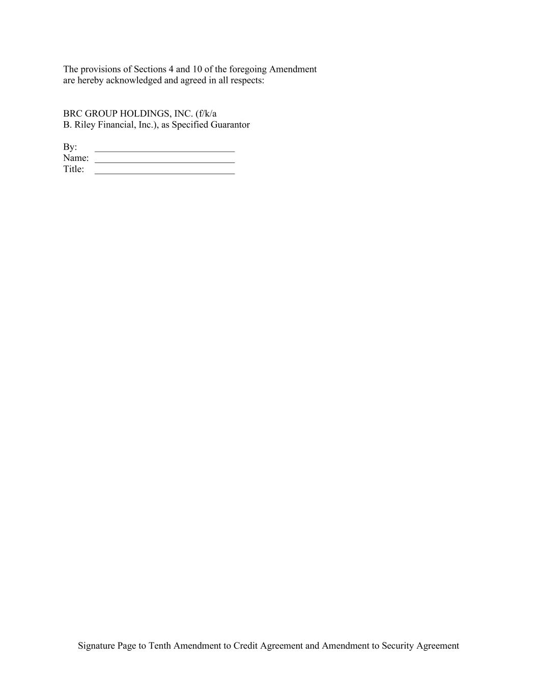 Signature Page to Tenth Amendment to Credit Agreement and Amendment to Security Agreement The provisions of Sections 4 and 10 of the foregoing Amendment are hereby acknowledged and agreed in all respects: BRC GROUP HOLDINGS, INC. (f/k/a B. Riley Financial, Inc.), as Specified Guarantor By: _____________________________ Name: _____________________________ Title: _____________________________