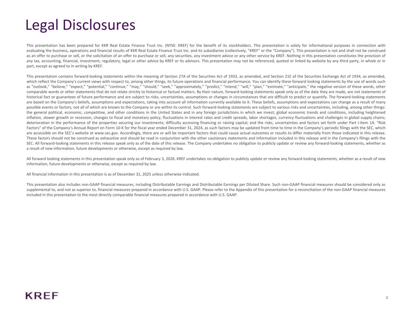 2 Legal Disclosures This presentation has been prepared for KKR Real Estate Finance Trust Inc. (NYSE: KREF) for the benefit of its stockholders. This presentation is solely for informational purposes in connection with evaluating the business, operations and financial results of KKR Real Estate Finance Trust Inc. and its subsidiaries (collectively, "KREF“ or the “Company”). This presentation is not and shall not be construed as an offer to purchase or sell, or the solicitation of an offer to purchase or sell, any securities, any investment advice or any other service by KREF. Nothing in this presentation constitutes the provision of any tax, accounting, financial, investment, regulatory, legal or other advice by KREF or its advisors. This presentation may not be referenced, quoted or linked by website by any third party, in whole or in part, except as agreed to in writing by KREF. This presentation contains forward-looking statements within the meaning of Section 27A of the Securities Act of 1933, as amended, and Section 21E of the Securities Exchange Act of 1934, as amended, which reflect the Company’s current views with respect to, among other things, its future operations and financial performance. You can identify these forward looking statements by the use of words such as “outlook,” “believe,” “expect,” “potential,” “continue,” “may,” “should,” “seek,” “approximately,” “predict,” “intend,” “will,” “plan,” “estimate,” “anticipate,” the negative version of these words, other comparable words or other statements that do not relate strictly to historical or factual matters. By their nature, forward-looking statements speak only as of the date they are made, are not statements of historical fact or guarantees of future performance and are subject to risks, uncertainties, assumptions or changes in circumstances that are difficult to predict or quantify. The forward-looking statements are based on the Company’s beliefs, assumptions and expectations, taking into account all information currently available to it. These beliefs, assumptions and expectations can change as a result of many possible events or factors, not all of which are known to the Company or are within its control. Such forward-looking statements are subject to various risks and uncertainties, including, among other things: the general political, economic, competitive, and other conditions in the United States and in any foreign jurisdictions in which we invest; global economic trends and conditions, including heightened inflation, slower growth or recession, changes to fiscal and monetary policy, fluctuations in interest rates and credit spreads, labor shortages, currency fluctuations and challenges in global supply chains; deterioration in the performance of the properties securing our investments; difficulty accessing financing or raising capital; and the risks, uncertainties and factors set forth under Part I-Item 1A. “Risk Factors” of the Company’s Annual Report on Form 10-K for the fiscal year ended December 31, 2024, as such factors may be updated from time to time in the Company’s periodic filings with the SEC, which are accessible on the SEC’s website at www.sec.gov. Accordingly, there are or will be important factors that could cause actual outcomes or results to differ materially from those indicated in this release. These factors should not be construed as exhaustive and should be read in conjunction with the other cautionary statements and information included in this release and in the Company’s filings with the SEC. All forward-looking statements in this release speak only as of the date of this release. The Company undertakes no obligation to publicly update or review any forward-looking statements, whether as a result of new information, future developments or otherwise, except as required by law. All forward looking statements in this presentation speak only as of February 3, 2026. KREF undertakes no obligation to publicly update or review any forward-looking statements, whether as a result of new information, future developments or otherwise, except as required by law. All financial information in this presentation is as of December 31, 2025 unless otherwise indicated. This presentation also includes non-GAAP financial measures, including Distributable Earnings and Distributable Earnings per Diluted Share. Such non-GAAP financial measures should be considered only as supplemental to, and not as superior to, financial measures prepared in accordance with U.S. GAAP. Please refer to the Appendix of this presentation for a reconciliation of the non-GAAP financial measures included in this presentation to the most directly comparable financial measures prepared in accordance with U.S. GAAP.