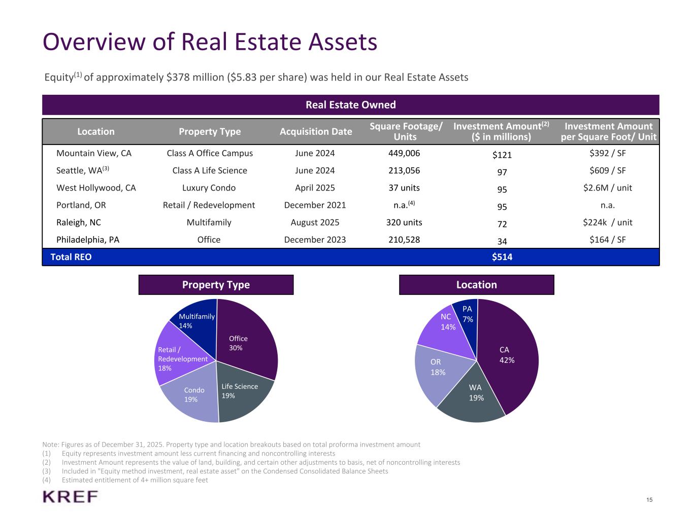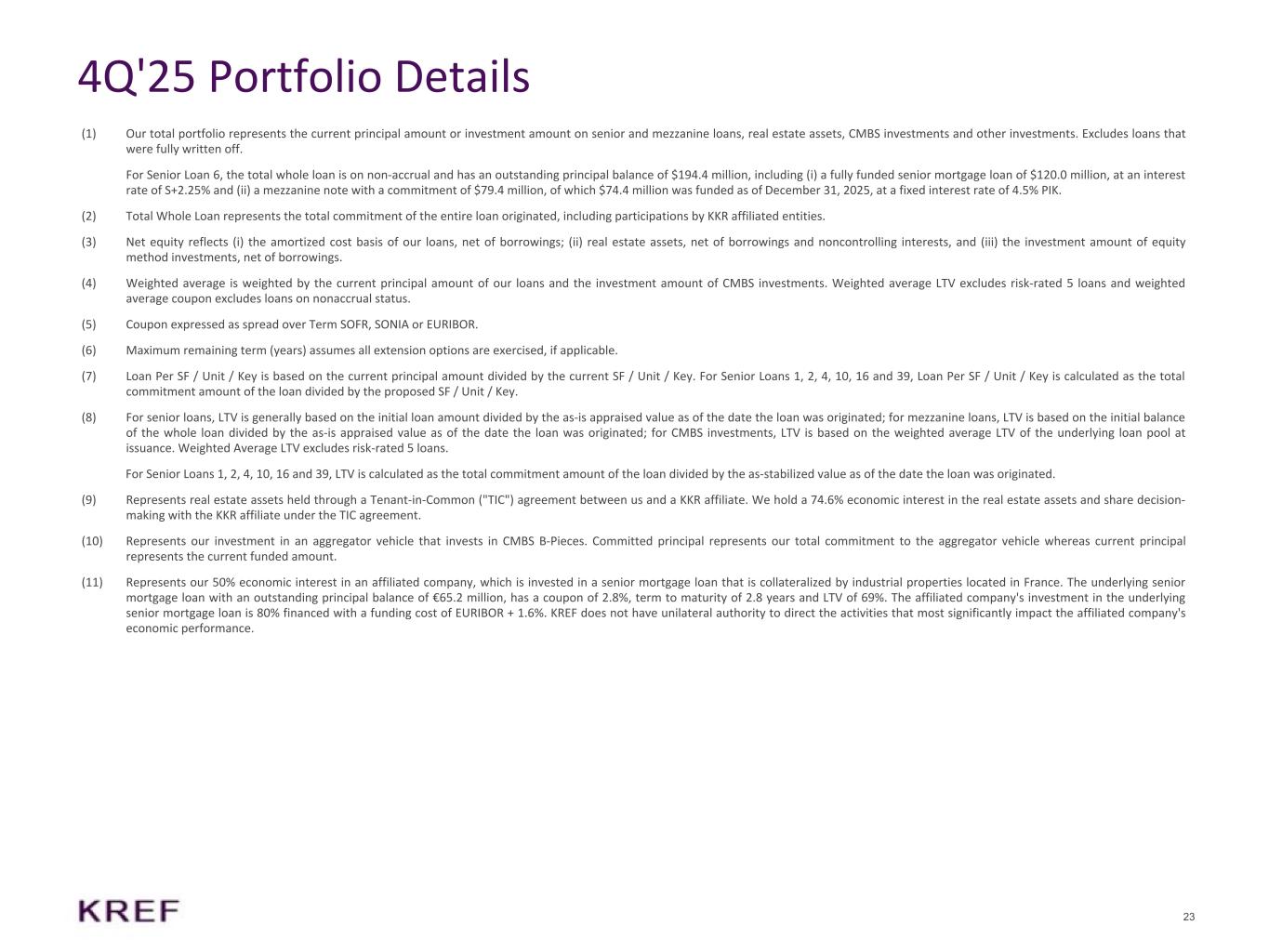23 4Q'25 Portfolio Details (1) Our total portfolio represents the current principal amount or investment amount on senior and mezzanine loans, real estate assets, CMBS investments and other investments. Excludes loans that were fully written off. For Senior Loan 6, the total whole loan is on non-accrual and has an outstanding principal balance of $194.4 million, including (i) a fully funded senior mortgage loan of $120.0 million, at an interest rate of S+2.25% and (ii) a mezzanine note with a commitment of $79.4 million, of which $74.4 million was funded as of December 31, 2025, at a fixed interest rate of 4.5% PIK. (2) Total Whole Loan represents the total commitment of the entire loan originated, including participations by KKR affiliated entities. (3) Net equity reflects (i) the amortized cost basis of our loans, net of borrowings; (ii) real estate assets, net of borrowings and noncontrolling interests, and (iii) the investment amount of equity method investments, net of borrowings. (4) Weighted average is weighted by the current principal amount of our loans and the investment amount of CMBS investments. Weighted average LTV excludes risk-rated 5 loans and weighted average coupon excludes loans on nonaccrual status. (5) Coupon expressed as spread over Term SOFR, SONIA or EURIBOR. (6) Maximum remaining term (years) assumes all extension options are exercised, if applicable. (7) Loan Per SF / Unit / Key is based on the current principal amount divided by the current SF / Unit / Key. For Senior Loans 1, 2, 4, 10, 16 and 39, Loan Per SF / Unit / Key is calculated as the total commitment amount of the loan divided by the proposed SF / Unit / Key. (8) For senior loans, LTV is generally based on the initial loan amount divided by the as-is appraised value as of the date the loan was originated; for mezzanine loans, LTV is based on the initial balance of the whole loan divided by the as-is appraised value as of the date the loan was originated; for CMBS investments, LTV is based on the weighted average LTV of the underlying loan pool at issuance. Weighted Average LTV excludes risk-rated 5 loans. For Senior Loans 1, 2, 4, 10, 16 and 39, LTV is calculated as the total commitment amount of the loan divided by the as-stabilized value as of the date the loan was originated. (9) Represents real estate assets held through a Tenant-in-Common ("TIC") agreement between us and a KKR affiliate. We hold a 74.6% economic interest in the real estate assets and share decision- making with the KKR affiliate under the TIC agreement. (10) Represents our investment in an aggregator vehicle that invests in CMBS B-Pieces. Committed principal represents our total commitment to the aggregator vehicle whereas current principal represents the current funded amount. (11) Represents our 50% economic interest in an affiliated company, which is invested in a senior mortgage loan that is collateralized by industrial properties located in France. The underlying senior mortgage loan with an outstanding principal balance of €65.2 million, has a coupon of 2.8%, term to maturity of 2.8 years and LTV of 69%. The affiliated company's investment in the underlying senior mortgage loan is 80% financed with a funding cost of EURIBOR + 1.6%. KREF does not have unilateral authority to direct the activities that most significantly impact the affiliated company's economic performance.