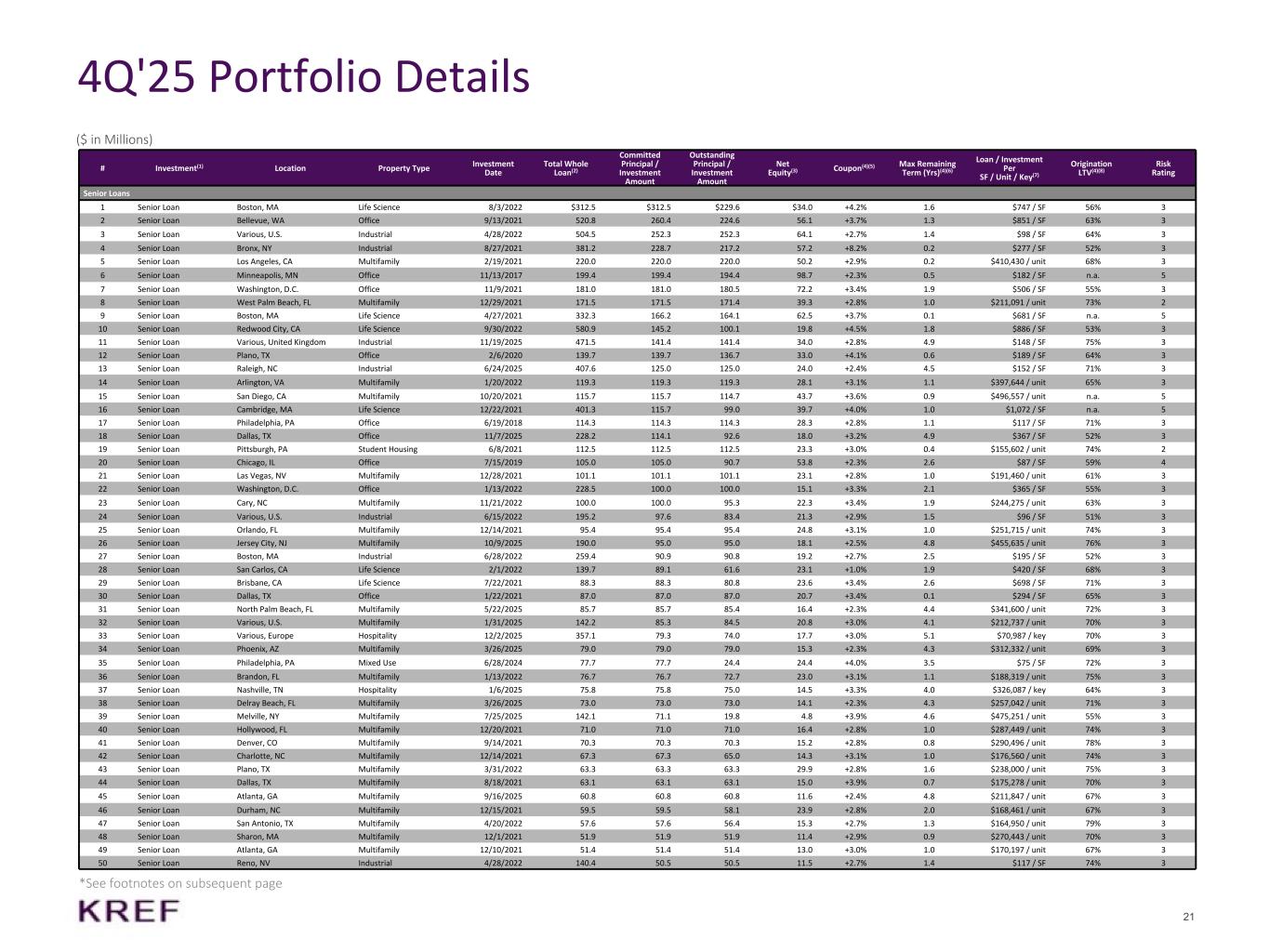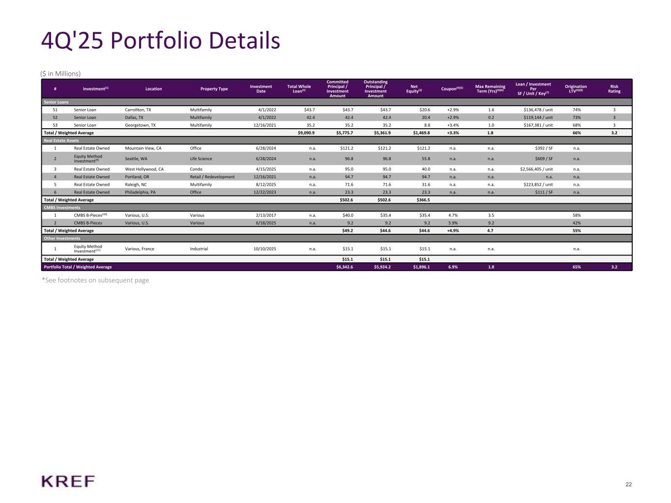 21 4Q'25 Portfolio Details ($ in Millions) # Investment(1) Location Property Type Investment Date Total Whole Loan(2) Committed Principal / Investment Amount Outstanding Principal / Investment Amount Net Equity(3) Coupon(4)(5) Max Remaining Term (Yrs)(4)(6) Loan / Investment Per SF / Unit / Key(7) Origination LTV(4)(8) Risk Rating Senior Loans 1 Senior Loan Boston, MA Life Science 8/3/2022 $312.5 $312.5 $229.6 $34.0 +4.2% 1.6 $747 / SF 56% 3 2 Senior Loan Bellevue, WA Office 9/13/2021 520.8 260.4 224.6 56.1 +3.7% 1.3 $851 / SF 63% 3 3 Senior Loan Various, U.S. Industrial 4/28/2022 504.5 252.3 252.3 64.1 +2.7% 1.4 $98 / SF 64% 3 4 Senior Loan Bronx, NY Industrial 8/27/2021 381.2 228.7 217.2 57.2 +8.2% 0.2 $277 / SF 52% 3 5 Senior Loan Los Angeles, CA Multifamily 2/19/2021 220.0 220.0 220.0 50.2 +2.9% 0.2 $410,430 / unit 68% 3 6 Senior Loan Minneapolis, MN Office 11/13/2017 199.4 199.4 194.4 98.7 +2.3% 0.5 $182 / SF n.a. 5 7 Senior Loan Washington, D.C. Office 11/9/2021 181.0 181.0 180.5 72.2 +3.4% 1.9 $506 / SF 55% 3 8 Senior Loan West Palm Beach, FL Multifamily 12/29/2021 171.5 171.5 171.4 39.3 +2.8% 1.0 $211,091 / unit 73% 2 9 Senior Loan Boston, MA Life Science 4/27/2021 332.3 166.2 164.1 62.5 +3.7% 0.1 $681 / SF n.a. 5 10 Senior Loan Redwood City, CA Life Science 9/30/2022 580.9 145.2 100.1 19.8 +4.5% 1.8 $886 / SF 53% 3 11 Senior Loan Various, United Kingdom Industrial 11/19/2025 471.5 141.4 141.4 34.0 +2.8% 4.9 $148 / SF 75% 3 12 Senior Loan Plano, TX Office 2/6/2020 139.7 139.7 136.7 33.0 +4.1% 0.6 $189 / SF 64% 3 13 Senior Loan Raleigh, NC Industrial 6/24/2025 407.6 125.0 125.0 24.0 +2.4% 4.5 $152 / SF 71% 3 14 Senior Loan Arlington, VA Multifamily 1/20/2022 119.3 119.3 119.3 28.1 +3.1% 1.1 $397,644 / unit 65% 3 15 Senior Loan San Diego, CA Multifamily 10/20/2021 115.7 115.7 114.7 43.7 +3.6% 0.9 $496,557 / unit n.a. 5 16 Senior Loan Cambridge, MA Life Science 12/22/2021 401.3 115.7 99.0 39.7 +4.0% 1.0 $1,072 / SF n.a. 5 17 Senior Loan Philadelphia, PA Office 6/19/2018 114.3 114.3 114.3 28.3 +2.8% 1.1 $117 / SF 71% 3 18 Senior Loan Dallas, TX Office 11/7/2025 228.2 114.1 92.6 18.0 +3.2% 4.9 $367 / SF 52% 3 19 Senior Loan Pittsburgh, PA Student Housing 6/8/2021 112.5 112.5 112.5 23.3 +3.0% 0.4 $155,602 / unit 74% 2 20 Senior Loan Chicago, IL Office 7/15/2019 105.0 105.0 90.7 53.8 +2.3% 2.6 $87 / SF 59% 4 21 Senior Loan Las Vegas, NV Multifamily 12/28/2021 101.1 101.1 101.1 23.1 +2.8% 1.0 $191,460 / unit 61% 3 22 Senior Loan Washington, D.C. Office 1/13/2022 228.5 100.0 100.0 15.1 +3.3% 2.1 $365 / SF 55% 3 23 Senior Loan Cary, NC Multifamily 11/21/2022 100.0 100.0 95.3 22.3 +3.4% 1.9 $244,275 / unit 63% 3 24 Senior Loan Various, U.S. Industrial 6/15/2022 195.2 97.6 83.4 21.3 +2.9% 1.5 $96 / SF 51% 3 25 Senior Loan Orlando, FL Multifamily 12/14/2021 95.4 95.4 95.4 24.8 +3.1% 1.0 $251,715 / unit 74% 3 26 Senior Loan Jersey City, NJ Multifamily 10/9/2025 190.0 95.0 95.0 18.1 +2.5% 4.8 $455,635 / unit 76% 3 27 Senior Loan Boston, MA Industrial 6/28/2022 259.4 90.9 90.8 19.2 +2.7% 2.5 $195 / SF 52% 3 28 Senior Loan San Carlos, CA Life Science 2/1/2022 139.7 89.1 61.6 23.1 +1.0% 1.9 $420 / SF 68% 3 29 Senior Loan Brisbane, CA Life Science 7/22/2021 88.3 88.3 80.8 23.6 +3.4% 2.6 $698 / SF 71% 3 30 Senior Loan Dallas, TX Office 1/22/2021 87.0 87.0 87.0 20.7 +3.4% 0.1 $294 / SF 65% 3 31 Senior Loan North Palm Beach, FL Multifamily 5/22/2025 85.7 85.7 85.4 16.4 +2.3% 4.4 $341,600 / unit 72% 3 32 Senior Loan Various, U.S. Multifamily 1/31/2025 142.2 85.3 84.5 20.8 +3.0% 4.1 $212,737 / unit 70% 3 33 Senior Loan Various, Europe Hospitality 12/2/2025 357.1 79.3 74.0 17.7 +3.0% 5.1 $70,987 / key 70% 3 34 Senior Loan Phoenix, AZ Multifamily 3/26/2025 79.0 79.0 79.0 15.3 +2.3% 4.3 $312,332 / unit 69% 3 35 Senior Loan Philadelphia, PA Mixed Use 6/28/2024 77.7 77.7 24.4 24.4 +4.0% 3.5 $75 / SF 72% 3 36 Senior Loan Brandon, FL Multifamily 1/13/2022 76.7 76.7 72.7 23.0 +3.1% 1.1 $188,319 / unit 75% 3 37 Senior Loan Nashville, TN Hospitality 1/6/2025 75.8 75.8 75.0 14.5 +3.3% 4.0 $326,087 / key 64% 3 38 Senior Loan Delray Beach, FL Multifamily 3/26/2025 73.0 73.0 73.0 14.1 +2.3% 4.3 $257,042 / unit 71% 3 39 Senior Loan Melville, NY Multifamily 7/25/2025 142.1 71.1 19.8 4.8 +3.9% 4.6 $475,251 / unit 55% 3 40 Senior Loan Hollywood, FL Multifamily 12/20/2021 71.0 71.0 71.0 16.4 +2.8% 1.0 $287,449 / unit 74% 3 41 Senior Loan Denver, CO Multifamily 9/14/2021 70.3 70.3 70.3 15.2 +2.8% 0.8 $290,496 / unit 78% 3 42 Senior Loan Charlotte, NC Multifamily 12/14/2021 67.3 67.3 65.0 14.3 +3.1% 1.0 $176,560 / unit 74% 3 43 Senior Loan Plano, TX Multifamily 3/31/2022 63.3 63.3 63.3 29.9 +2.8% 1.6 $238,000 / unit 75% 3 44 Senior Loan Dallas, TX Multifamily 8/18/2021 63.1 63.1 63.1 15.0 +3.9% 0.7 $175,278 / unit 70% 3 45 Senior Loan Atlanta, GA Multifamily 9/16/2025 60.8 60.8 60.8 11.6 +2.4% 4.8 $211,847 / unit 67% 3 46 Senior Loan Durham, NC Multifamily 12/15/2021 59.5 59.5 58.1 23.9 +2.8% 2.0 $168,461 / unit 67% 3 47 Senior Loan San Antonio, TX Multifamily 4/20/2022 57.6 57.6 56.4 15.3 +2.7% 1.3 $164,950 / unit 79% 3 48 Senior Loan Sharon, MA Multifamily 12/1/2021 51.9 51.9 51.9 11.4 +2.9% 0.9 $270,443 / unit 70% 3 49 Senior Loan Atlanta, GA Multifamily 12/10/2021 51.4 51.4 51.4 13.0 +3.0% 1.0 $170,197 / unit 67% 3 50 Senior Loan Reno, NV Industrial 4/28/2022 140.4 50.5 50.5 11.5 +2.7% 1.4 $117 / SF 74% 3 *See footnotes on subsequent page