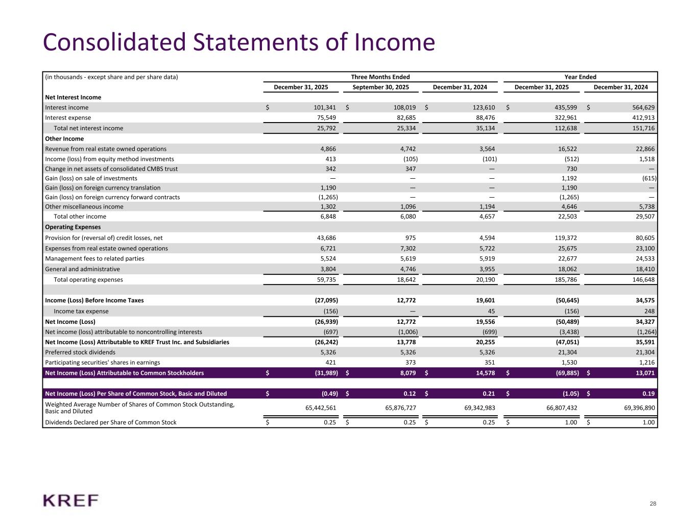28 Consolidated Statements of Income (in thousands - except share and per share data) Three Months Ended Year Ended December 31, 2025 September 30, 2025 December 31, 2024 December 31, 2025 December 31, 2024 Net Interest Income Interest income $ 101,341 $ 108,019 $ 123,610 $ 435,599 $ 564,629 Interest expense 75,549 82,685 88,476 322,961 412,913 Total net interest income 25,792 25,334 35,134 112,638 151,716 Other Income Revenue from real estate owned operations 4,866 4,742 3,564 16,522 22,866 Income (loss) from equity method investments 413 (105) (101) (512) 1,518 Change in net assets of consolidated CMBS trust 342 347 — 730 — Gain (loss) on sale of investments — — — 1,192 (615) Gain (loss) on foreign currency translation 1,190 — — 1,190 — Gain (loss) on foreign currency forward contracts (1,265) — — (1,265) — Other miscellaneous income 1,302 1,096 1,194 4,646 5,738 Total other income 6,848 6,080 4,657 22,503 29,507 Operating Expenses Provision for (reversal of) credit losses, net 43,686 975 4,594 119,372 80,605 Expenses from real estate owned operations 6,721 7,302 5,722 25,675 23,100 Management fees to related parties 5,524 5,619 5,919 22,677 24,533 General and administrative 3,804 4,746 3,955 18,062 18,410 Total operating expenses 59,735 18,642 20,190 185,786 146,648 Income (Loss) Before Income Taxes (27,095) 12,772 19,601 (50,645) 34,575 Income tax expense (156) — 45 (156) 248 Net Income (Loss) (26,939) 12,772 19,556 (50,489) 34,327 Net income (loss) attributable to noncontrolling interests (697) (1,006) (699) (3,438) (1,264) Net Income (Loss) Attributable to KREF Trust Inc. and Subsidiaries (26,242) 13,778 20,255 (47,051) 35,591 Preferred stock dividends 5,326 5,326 5,326 21,304 21,304 Participating securities' shares in earnings 421 373 351 1,530 1,216 Net Income (Loss) Attributable to Common Stockholders $ (31,989) $ 8,079 $ 14,578 $ (69,885) $ 13,071 Net Income (Loss) Per Share of Common Stock, Basic and Diluted $ (0.49) $ 0.12 $ 0.21 $ (1.05) $ 0.19 Weighted Average Number of Shares of Common Stock Outstanding, Basic and Diluted 65,442,561 65,876,727 69,342,983 66,807,432 69,396,890 Dividends Declared per Share of Common Stock $ 0.25 $ 0.25 $ 0.25 $ 1.00 $ 1.00