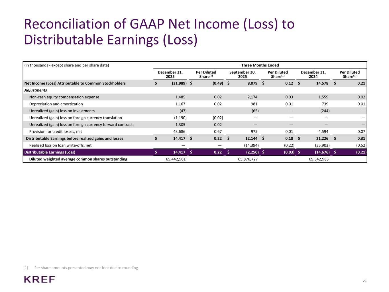 30 Reconciliation of GAAP Net Income (Loss) to Distributable Earnings (Loss) (1) Per share amounts presented may not foot due to rounding (in thousands - except share and per share data) Year Ended December 31, 2025 Per Diluted Share(1) December 31, 2024 Per Diluted Share(1) December 31, 2023 Per Diluted Share(1) Net Income (Loss) Attributable to Common Stockholders $ (69,885) $ (1.05) $ 13,071 $ 0.19 $ (53,919) $ (0.78) Adjustments Non-cash equity compensation expense 7,927 0.12 8,261 0.12 8,075 0.12 Depreciation and amortization 3,628 0.05 1,471 0.02 — — Unrealized (gain) loss on investments (5) — (545) (0.01) 1,859 0.03 Unrealized (gain) loss on foreign currency translation (1,190) (0.02) — — — — Unrealized (gain) loss on foreign currency forward contracts 1,305 0.02 — — — — Provision for credit losses, net 119,372 1.79 80,605 1.16 175,116 2.53 (Gain) loss on sale of investments (1,192) (0.02) 615 0.01 — — Non-cash convertible notes discount amortization — — — — 133 — Distributable Earnings before realized gains and losses $ 59,960 $ 0.90 $ 103,478 $ 1.49 $ 131,264 $ 1.90 Realized loss on loan write-offs, net (34,828) (0.52) (173,546) (2.50) (73,706) (1.07) Realized gain (loss) on sale of investments 1,192 0.02 (615) (0.01) — — Distributable Earnings (Loss) $ 26,324 $ 0.39 $ (70,683) $ (1.02) $ 57,558 $ 0.83 Diluted weighted average common shares outstanding 66,807,432 69,396,890 69,180,039