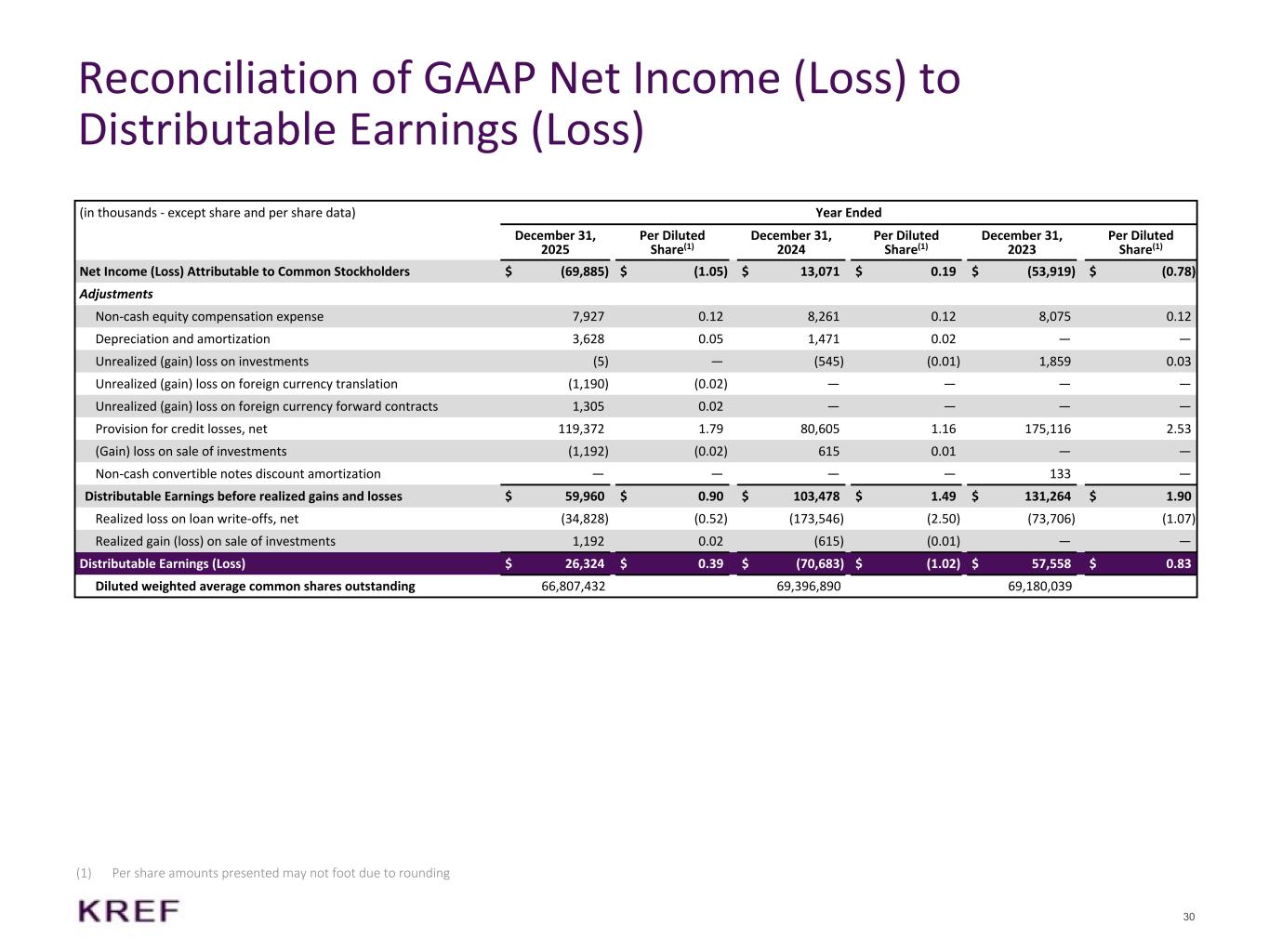 29 Reconciliation of GAAP Net Income (Loss) to Distributable Earnings (Loss) (1) Per share amounts presented may not foot due to rounding (in thousands - except share and per share data) Three Months Ended December 31, 2025 Per Diluted Share(1) September 30, 2025 Per Diluted Share(1) December 31, 2024 Per Diluted Share(1) Net Income (Loss) Attributable to Common Stockholders $ (31,989) $ (0.49) $ 8,079 $ 0.12 $ 14,578 $ 0.21 Adjustments Non-cash equity compensation expense 1,485 0.02 2,174 0.03 1,559 0.02 Depreciation and amortization 1,167 0.02 981 0.01 739 0.01 Unrealized (gain) loss on investments (47) — (65) — (244) — Unrealized (gain) loss on foreign currency translation (1,190) (0.02) — — — — Unrealized (gain) loss on foreign currency forward contracts 1,305 0.02 — — — — Provision for credit losses, net 43,686 0.67 975 0.01 4,594 0.07 Distributable Earnings before realized gains and losses $ 14,417 $ 0.22 $ 12,144 $ 0.18 $ 21,226 $ 0.31 Realized loss on loan write-offs, net — — (14,394) (0.22) (35,902) (0.52) Distributable Earnings (Loss) $ 14,417 $ 0.22 $ (2,250) $ (0.03) $ (14,676) $ (0.21) Diluted weighted average common shares outstanding 65,442,561 65,876,727 69,342,983