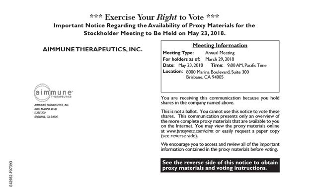 *** Exercise Your Right to Vote *** Important Notice Regarding the Availability of Proxy Materials for the Stockholder Meeting to Be Held on May 23, 2018. Meeting Information AIMMUNE THERAPEUTICS, INC. Meeting Type: Annual Meeting For holders as of: March 29, 2018 Date: May 23, 2018 Time: 9:00 AM, Pacific Time Location: 8000 Marina Boulevard, Suite 300 Brisbane, CA 94005 You are receiving this communication because you hold shares in the company named above. This is not a ballot. You cannot use this notice to vote these shares. This communication presents only an overview of the more complete proxy materials that are available to you on the Internet. You may view the proxy materials online at www.proxyvote.com/aimt or easily request a paper copy (see reverse side). We encourage you to access and review all of the important information contained in the proxy materials before voting. E42982-P07393 AIMMUNE THERAPEUTICS, INC. 8000 MARINA BLVD. SUITE 300 BRISBANE, CA 94005 See the reverse side of this notice to obtain proxy materials and voting instructions.