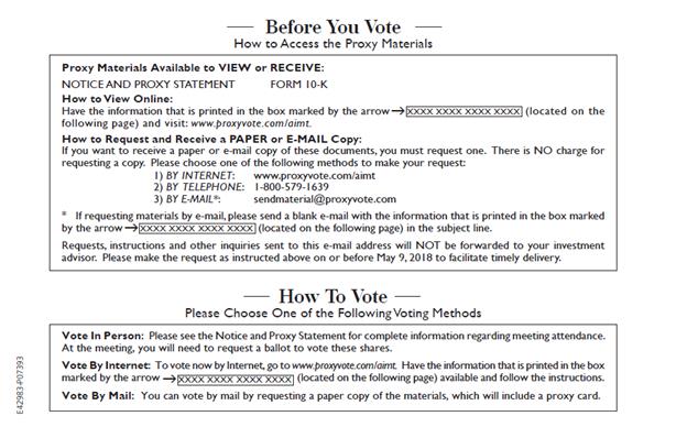 Before You Vote How to Access the Proxy Materials Proxy Materials Available to VIEW or RECEIVE: NOTICE AND PROXY STATEMENT FORM 10-K How to View Online: Have the information that is printed in the box marked by the arrow (located on the following page) and visit: www.proxyvote.com/aimt. How to Request and Receive a PAPER or E-MAIL Copy: If you want to receive a paper or e-mail copy of these documents, you must request one. There is NO charge for requesting a copy. Please choose one of the following methods to make your request: 1) BY INTERNET: www.proxyvote.com/aimt 2) BY TELEPHONE: 1-800-579-1639 3) BY E-MAIL*: sendmaterial@proxyvote.com * If requesting materials by e-mail, please send a blank e-mail with the information that is printed in the box marked by the arrow (located on the following page) in the subject line. XXXX XXXX XXXX XXXX E42983-P07393. XXXX XXXX XXXX XXXX