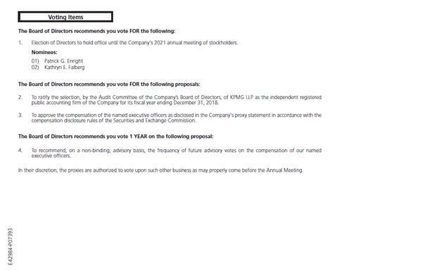 Voting Items The Board of Directors recommends you vote FOR the following:1. Election of Directors to hold office until the Company's 2021 annual meeting of stockholders.Nominees:01) Patrick G. Enright 02) Kathryn E. FalbergThe Board of irectors recommends you vote FOR the following proposals:2. To ratify the selection, by the Audit Committee of the company’s oard of Directors, of KPMG LLP as the independent registered public accounting firm of the Company for its fiscal year n ding December 31, 2018.3. To approve the compensation of the named executive officers as disclosed in the Company's proxy statement in accordance with the compensation disclosure rules of the Securities and Exchange Commission.The Board of Directors recommends you vote 1 YEAR on the following proposal:E42984-P073934. To recommend, on a non-binding, advisory basis, the frequency of future advisory votes on the compensation of our named executive officers.In their discretion, the proxies are authorized to vote upon such other business as may properly come before the Annual Meeting.