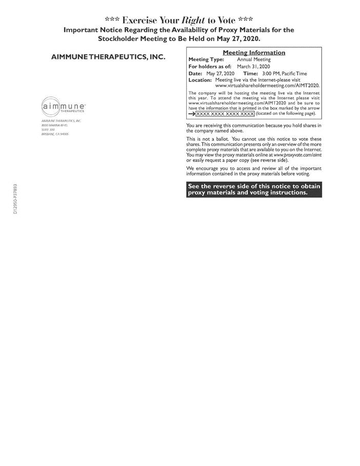 *** Exercise Your Right to Vote *** Important Notice Regarding the Availability of Proxy Materials for the Stockholder Meeting to Be Held on May 27, 2020. AIMMUNE THERAPEUTICS, INC. Meeting Information Meeting Type: Annual Meeting For holders as of: March 31, 2020 Date: May 27, 2020 Time: 3:00 PM, Pacific TimeLocation: Meeting live via the Internet-please visit www.virtualshareholdermeeting.com/AIMT2020. The company will be hosting the meeting live via the Internet this year. To attend the meeting via the Internet please visit www.virtualshareholdermeeting.com/AIMT2020 and be sure to have the information that is printed in the box marked by the arrow XXXX XXXX XXXX XXXX (located on the following page). AIMMUNE THERAPEUTICS, INC. 8000 MARINA BLVD. SUITE 300 BRISBANE, CA 94005 You are receiving this communication because you hold shares in the company named above. This is not a ballot. You cannot use this notice to vote these shares. This communication presents only an overview of the more complete proxy materials that are available to you on the Internet. You may view the proxy materials online at www.proxyvote.com/aimt or easily request a paper copy (see reverse side). We encourage you to access and review all of the important information contained in the proxy materials before voting. D12950-P37893 See the reverse side of this notice to obtain proxy materials and voting instructions.