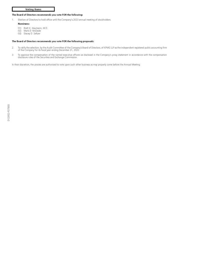 The Board of Directors recommends you vote FOR the following: 1. Election of Directors to hold office until the Company's 2023 annual meeting of stockholders. Nominees: 01) Brett K. Haumann, M.D. 02) Mark D. McDade 03) Stacey D. Seltzer The Board of Directors recommends you vote FOR the following proposals: 2. To ratify the selection, by the Audit Committee of the Company’s Board of Directors, of KPMG LLP as the independent registered public accounting firm of the Company for its fiscal year ending December 31, 2020. 3. To approve the compensation of the named executive officers as disclosed in the Company's proxy statement in accordance with the compensation disclosure rules of the Securities and Exchange Commission. In their discretion, the proxies are authorized to vote upon such other business as may properly come before the Annual Meeting. D12952-P37893