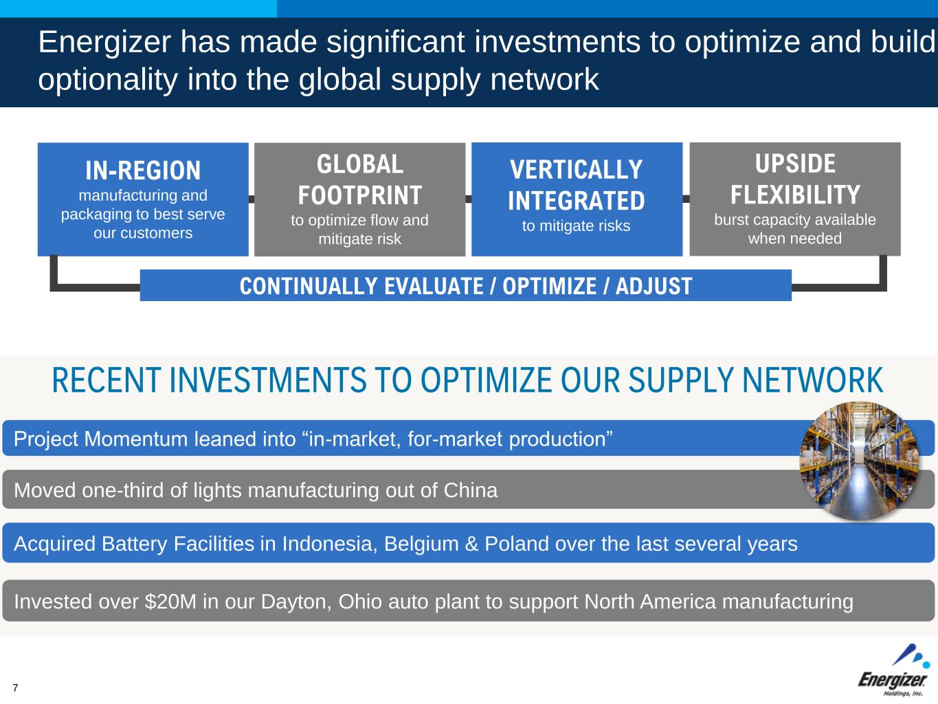 Energizer has made significant investments to optimize and build optionality into the global supply network Project Momentum leaned into “in-market, for-market production” Moved one-third of lights manufacturing out of China Acquired Battery Facilities in Indonesia, Belgium & Poland over the last several years RECENT INVESTMENTS TO OPTIMIZE OUR SUPPLY NETWORK IN-REGION manufacturing and packaging to best serve our customers GLOBAL FOOTPRINT to optimize flow and mitigate risk VERTICALLY INTEGRATED to mitigate risks UPSIDE FLEXIBILITY burst capacity available when needed CONTINUALLY EVALUATE / OPTIMIZE / ADJUST Invested over $20M in our Dayton, Ohio auto plant to support North America manufacturing 7