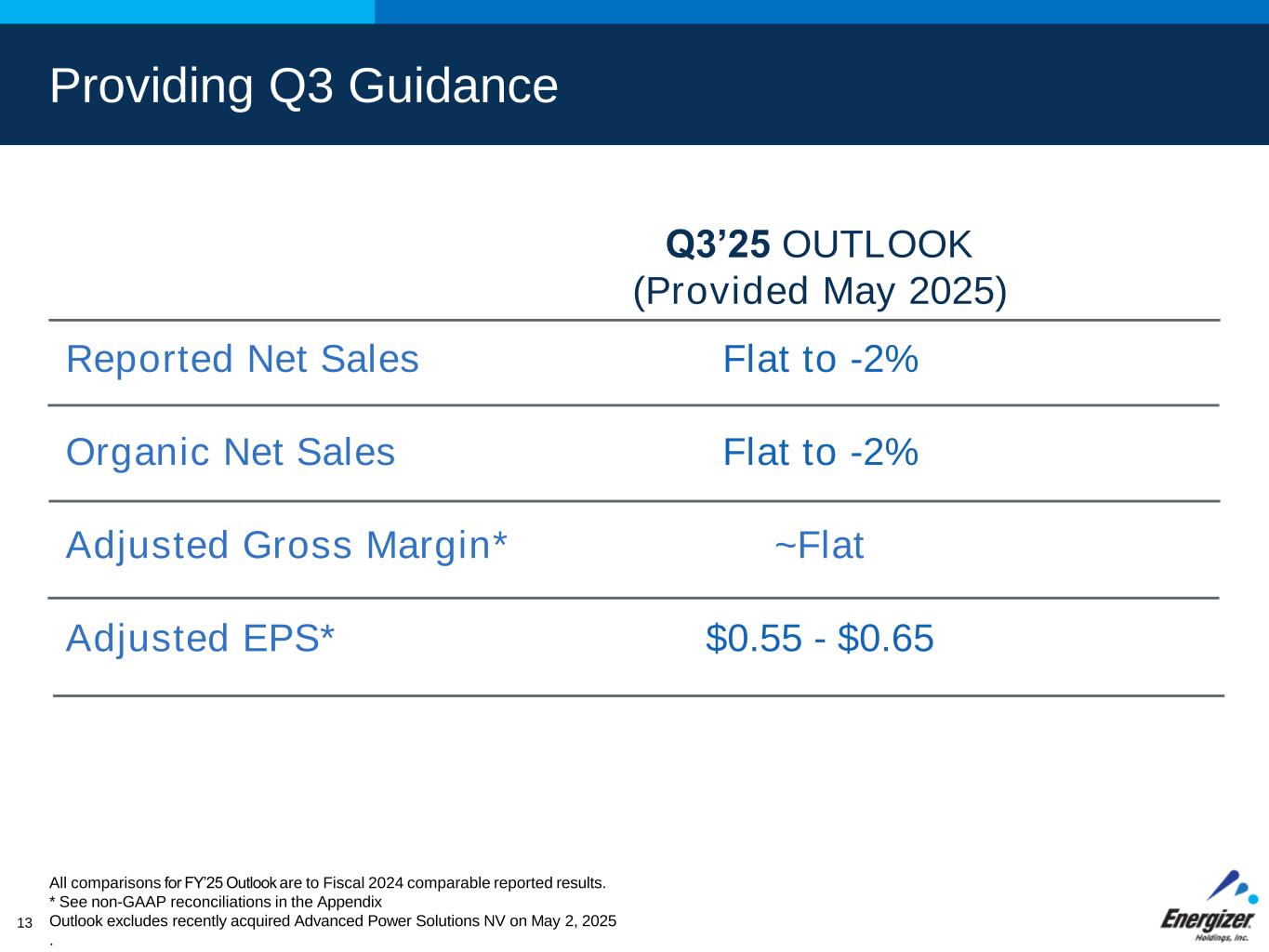 Updating FY’25 Guidance +1% to +2% +2% to +3% +50bps $3.45 - $3.65 $625M - $645M 8-10% of Net Sales Prior FY’25 Outlook (Provided February 2025) 12 All comparisons for Fiscal 2025 outlook are to Fiscal 2024 comparable reported results. * See non-GAAP reconciliations in the Appendix. Outlook excludes recently acquired Advanced Power Solutions NV on May 2, 2025 Reported Net Sales Organic Net Sales Adjusted Gross Margin* Adjusted EPS* Adjusted EBITDA* Free Cash Flow Updated FY’25 Outlook (Provided May 2025) Flat to +2% Flat to +2% +50bps $3.30 - $3.50 $610M - $630M 6-8% of Net Sales