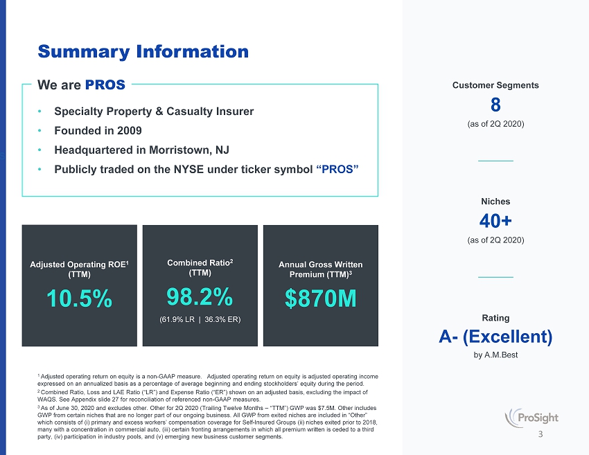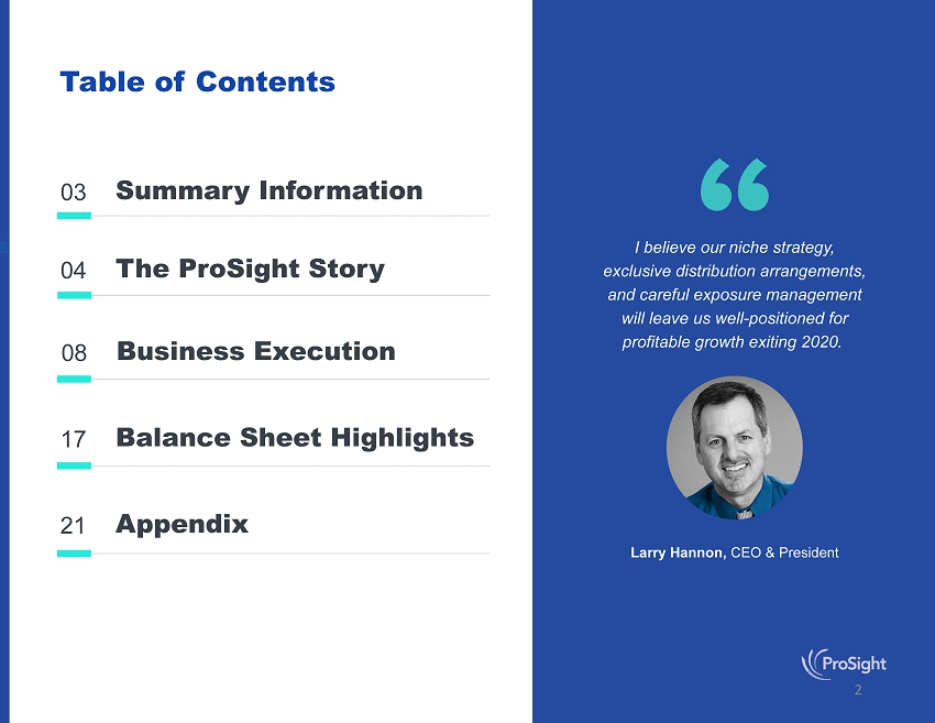 2 Table of Contents I believe our niche strategy, exclusive distribution arrangements, and careful exposure management will leave us well - positioned for profitable growth exiting 2020. Larry Hannon, CEO & President 03 Summary Information 04 The ProSight Story 08 Business Execution 17 Balance Sheet Highlights 21 Appendix