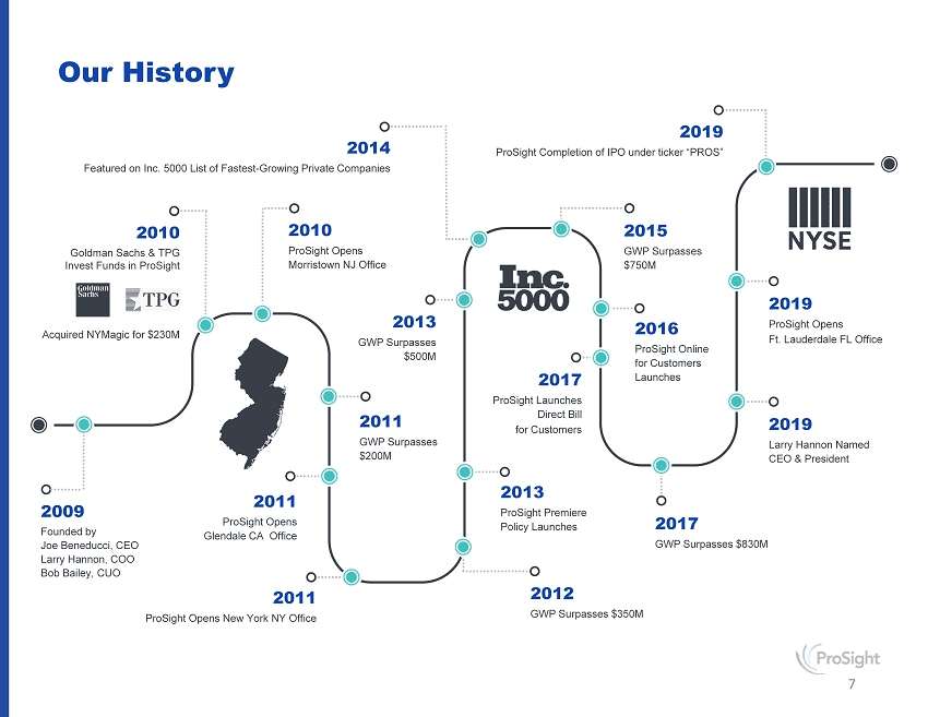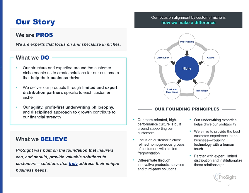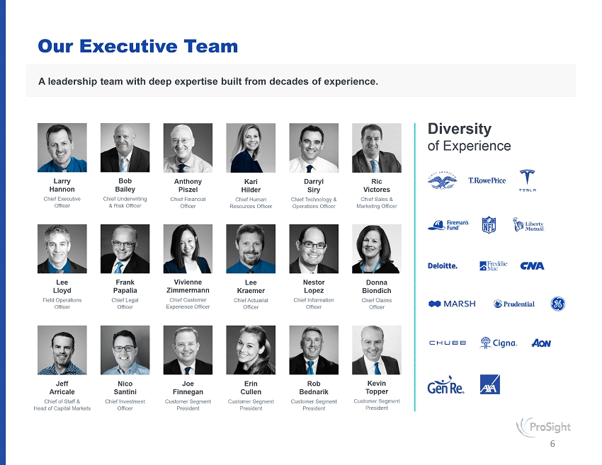 5 We are experts that focus on and specialize in niches. Our focus on alignment by customer niche is how we make a difference • Our team - oriented, high - performance culture is built around supporting our customers • Focus on customer niches: refined homogeneous groups of customers with limited fragmentation • Differentiate through innovative products, services and third - party solutions • Our underwriting expertise helps drive our profitability • We strive to provide the best customer experience in the business — coupling technology with a human touch • Partner with expert, limited distribution and institutionalize those relationships OUR FOUNDING PRINCIPLES ProSight was built on the foundation that insurers can, and should, provide valuable solutions to customers — solutions that truly address their unique business needs. What we BELIEVE • Our structure and expertise around the customer niche enable us to create solutions for our customers that help their business thrive • We deliver our products through limited and expert distribution partners specific to each customer niche • Our agility, profit - first underwriting philosophy, and disciplined approach to growth contribute to our financial strength What we DO We are PROS Our Story