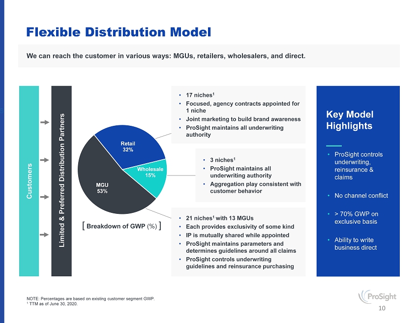 9 GWP: $870M 2 (trailing twelve months) Niche - Focused Specialty Insurer Diversified portfolio with 8 customer segments and over 40 specialty niches 1 . 1 As of June 30, 2020. 2 Excludes other. Other 2Q 2020 (TTM) GWP was $7.5M. 3 New niches added within preceding 4 quarters. Media & Entertainment $111 Million o Film o Live Entertainment Marine & Energy $109 Million o Marine & Excess Energy o Solar Contractors o Oil Field Contractors o Propane & Fuel Dealers Transportation $71 Million o Charter Bus o School Bus o Intermodal Transportation o Taxis Sports $30 Million o Motor Sports o Sports o Country Clubs o Aquatic Recreation Real Estate $173 Million o Builders Risk o Hotels o MetroBuilders o Residential o Manufactured Housing o Property Managers o Self Storage (NEW) 3 Professional Services $122 Million o Accountants o Credit Unions o Customs Brokers o Lawyers o Pest Control Construction $114 Million o Cranes o Scaffolding o Marine Contractors o Construction Managers o Federal Contractors o Luxury Home Builders o Specialty Trade Contractors Consumer Services $140 Million o Auto Dealers o Franchise Equipment Dealers o Professional Employer Organizations o Funeral Directors (NEW) 3 o Social Services o Parking Facilities o Snow & Ice Mgmt (NEW) 3 o Animal Welfare (NEW) 3