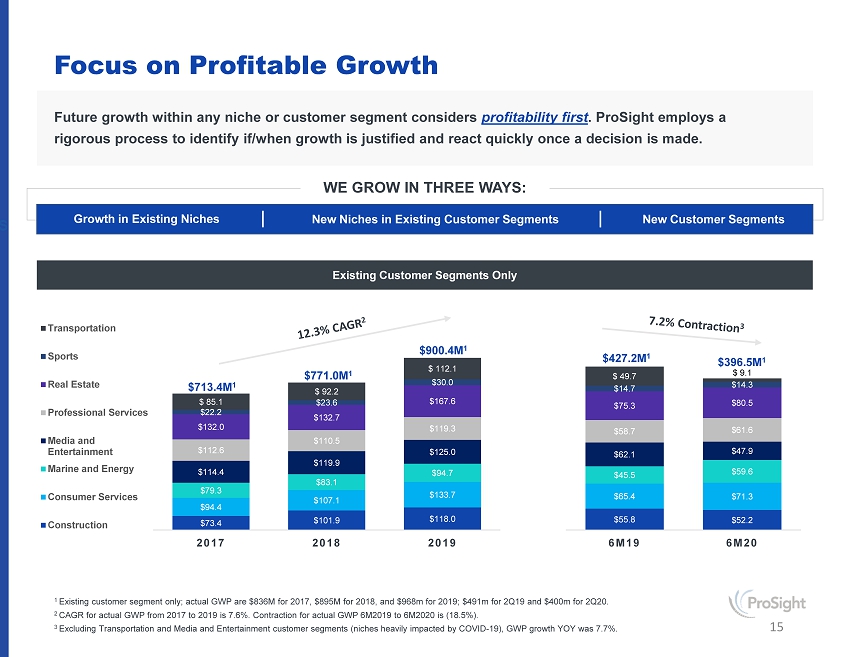 61.7% 62.0% 62.5% 61.8% 6M19 6M20 14 Profitable Underwriting & Low Volatility • Inception - to - date (2011 to 2020) GAAP loss ratio of 63.6% for all business and 61.4% for existing customer segments • Selective entry (and exit) of niches part of our underwriting strategy • Low catastrophe exposure — since 2011, catastrophic losses 1 have averaged less than 1.0 point on combined ratio. • ProSight expects 200 basis points of expense ratio improvement from 2019 (36.6%) by YE 2022 1 Catastrophe losses and LAE are any one claim, or group of claims, equal or greater than $1M related to a single PCS® designat ed catastrophe event. 2 Expense ratio shown is Adjusted Expense Ratio. See “Factors Affecting our Results of Operations (WAQS)” in the Appendix. Effe cti ve January 1, 2020, the WAQS was commuted and there is no further impact to the expense ratio. 3 GWP shown as TTM. NOTE: Loss Ratios as presented, adjusted for Whole Account Quota Share, except where otherwise noted. See “Factors Affecting our Results of Operations (WAQS)” in the Appendix. General Liability 32% Commercial Auto 22% Primary Workers Comp 13% Misc. Lines 8% Property 14% Prof. Liability 5% Umbrella 6% Diversified by Line of Business 3 86% 14% 78% 22% - Casualty 3 - Property 3 - Admitted 3 - Non - Admitted (E&S) 3 Expense Ratio 2 34.9% 37.0% 36.6% 2017 2018 2019 Loss Ratio 6M19 6M20 Calendar Year Loss Ratio Accident Year Loss Ratio Catastrophic Loss 63.9% 59.6% 61.4% 61.0% 60.3% 61.6% 2017 2018 2019 1.3% 0.5% 0.4% 0.8% 0.9% 37.1% 36.7%