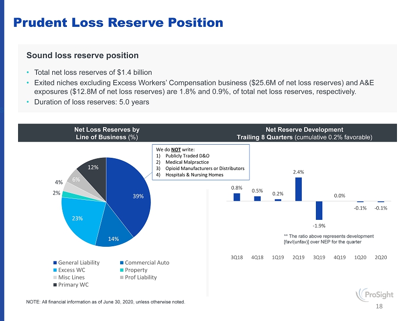 17 Diversified & Liquid Investment Portfolio • $2.3 billion conservatively managed investment portfolio • No common stocks, private equity, CLO equity or venture capital • CLO and CMBS allocation average rating AA with no securities below single A • 63% of Not Rated fixed maturity securities are considered investment grade by the NAIC • Floating rate allocation 16% • Trailing Twelve Months (TTM) investment yield of 3.1% • Portfolio duration of 4.5 years vs. loss reserve duration of 5.0 years Fixed Maturity Securities 92.9% Limited Partnerships and LLCs 3.4% Cash, Cash Equivalents & Short - term Investments 2.6% Commercial Levered Loans 0.5% Non - redeemable Preferred Stock Securities 0.5% Corporate Securities 62.5% RMBS 12.0% CLO 7.8% CMBS 4.8% Municipals 7.6% ABS 2.3% U.S. Gov't & Gov't Agency 3.1% A 31.6% AA 22.8% AAA 9.5% Not Rated 3.1% Below BBB 6.7% BBB 26.3% 36.2 56.0 68.9 2017 2018 2019 NOTE: All financial information as of June 30, 2020, unless otherwise noted. Maximizing investment income while minimizing volatility Net Investment Income ($ in millions) Investment Portfolio Composition Fixed Maturity Securities (by type) Fixed Maturity Securities (by rating) NOTE: ProSight engages leading 3rd Party investment managers to assist with managing the portfolio. 6M19 6M20 34.6 32.6