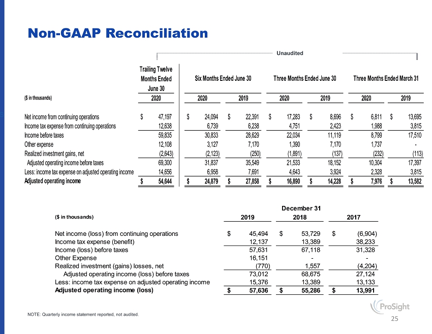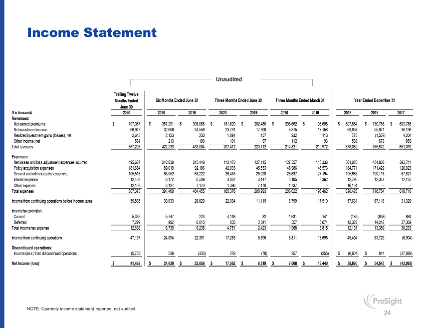 June 30 ($ in thousands, except share amounts) 2020 2019 2018 2017 2016 Assets (as restated) (as restated) (as restated) Investments: Fixed maturity securities, available-for-sale at fair value 2,162,780$ 2,040,682$ 1,693,382$ 1,484,431$ 1,222,234$ Commercial levered loans at amortized cost 13,463 14,069 16,915 24,500 29,834 Non-redeemable preferred stock securities at fair value 11,785 – – – – Limited partnerships and limited liability companies at fair value 79,717 66,660 53,432 41,603 33,383 Short-term investments 496 43,873 36,661 4,223 44,922 Total investments 2,268,241 2,165,284 1,800,390 1,554,757 1,330,373 Cash and cash equivalents 50,637 17,284 22,279 59,397 75,211 Restricted cash 9,966 10,213 7,621 18,475 – Accrued investment income 14,119 13,610 12,279 9,409 5,353 Premiums and other receivables, net 143,519 190,004 200,347 184,334 168,378 Receivable from reinsurers on paid losses, net 2,497 3,481 12,428 17,220 28,876 Reinsurance receivables on unpaid losses, net 141,427 193,952 185,295 201,156 176,651 Deferred policy acquisition costs 94,587 98,812 93,613 60,759 76,572 Prepaid reinsurance premiums 47,837 42,861 44,626 122,950 30,896 Net deferred income taxes – 4,803 33,239 37,068 76,784 Goodwill and net intangible assets 29,174 29,189 29,219 29,249 29,745 Fixed assets and capitalized software, net 35,630 37,167 39,001 37,834 33,068 Funds withheld related to sale of affiliate 19,529 19,453 19,397 26,988 – Other assets 34,218 29,537 57,653 37,159 24,765 Assets of discontinued operations 23,171 21,584 19,719 12,697 194,831 Total assets 2,914,552$ 2,877,234$ 2,577,106$ 2,409,452$ 2,251,503$ Liabilities Reserve for unpaid losses and loss adjustment expenses 1,544,123$ 1,521,648$ 1,396,812$ 1,258,237$ 1,166,619$ Reserve for unearned premiums 450,934 483,223 435,933 395,432 354,828 Ceded reinsurance payable 20,324 17,768 13,281 18,448 2,816 Notes payable, net of debt issuance costs 164,862 164,693 182,355 164,017 163,678 Secured loan payable, net of issuance costs 24,997 – – – – Funds held under reinsurance agreements 22,858 58,855 63,165 112,260 20,589 Net deferred income taxes 75 – – – – Other liabilities 66,762 56,438 73,474 71,014 21,522 Liabilities of discontinued operations 33,517 31,578 22,256 14,061 140,796 Total liabilities 2,328,452 2,334,203 2,187,276 2,033,469 1,870,848 Stockholders’ equity Preferred stock, $0.01 par value – – – – – Common stock, $0.01 par value 433 431 389 387 355 Paid-in capital 664,895 661,761 607,260 606,346 555,289 Accumulated other comprehensive income (loss) 52,756 37,453 (22,315) 19,297 29,482 Retained deficit (131,784) (156,414) (195,304) (249,847) (204,271) Treasury shares - at cost (12,920 shares) (200) (200) (200) (200) (200) Total stockholders’ equity 586,100 543,031 389,830 375,983 380,655 Total liabilities and stockholders’ equity 2,914,552$ 2,877,234$ 2,577,106$ 2,409,452$ 2,251,503$ Statutory surplus 661,314$ 568,777$ 473,575$ 433,946$ 355,366$ December 31 23 Balance Sheet Note: For informational purposes only and should be read in conjunction with documents filed by ProSight Global, Inc. with the Securities and Exchange Commission, including the most recent prospectus on Form S - 1, Quarterly Reports on Form 10 - Q, and Annual Reports on Form 10 - K. Unaudited