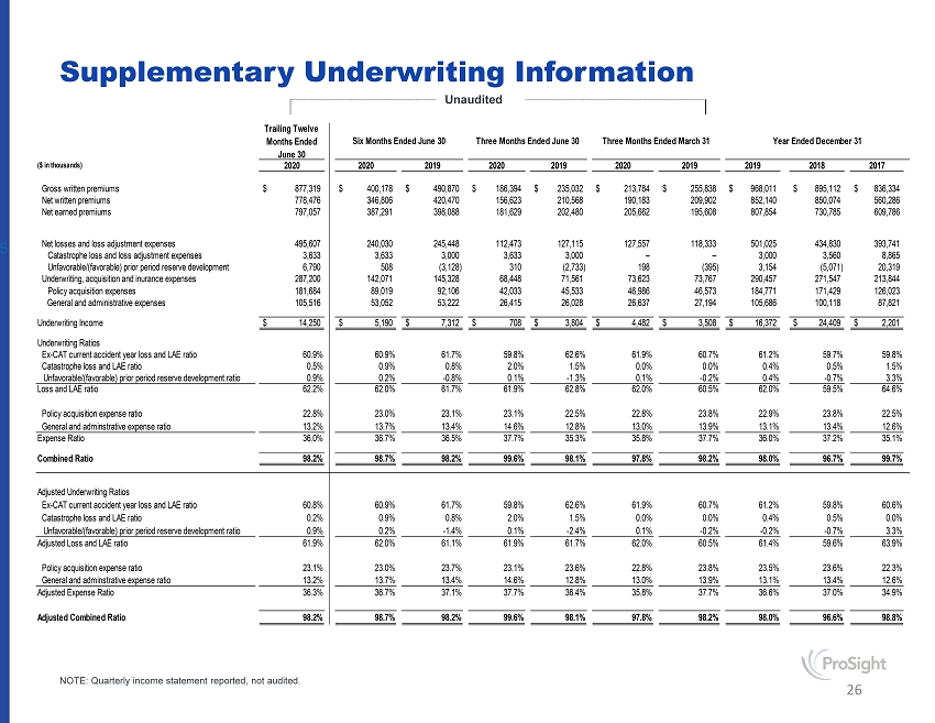 ($ in thousands) 2019 2018 2017 Net income (loss) from continuing operations 45,494$ 53,729$ (6,904)$ Income tax expense (benefit) 12,137 13,389 38,233 Income (loss) before taxes 57,631 67,118 31,328 Other Expense 16,151 - - Realized investment (gains) losses, net (770) 1,557 (4,204) Adjusted operating income (loss) before taxes 73,012 68,675 27,124 Less: income tax expense on adjusted operating income 15,376 13,389 13,133 Adjusted operating income (loss) 57,636$ 55,286$ 13,991$ December 31 Trailing Twelve Months Ended June 30 ($ in thousands) 2020 2020 2019 2020 2019 2020 2019 Net income from continuing operations 47,197$ 24,094$ 22,391$ 17,283$ 8,696$ 6,811$ 13,695$ Income tax expense from continuing operations 12,638 6,739 6,238 4,751 2,423 1,988 3,815 Income before taxes 59,835 30,833 28,629 22,034 11,119 8,799 17,510 Other expense 12,108 3,127 7,170 1,390 7,170 1,737 - Realized investment gains, net (2,643) (2,123) (250) (1,891) (137) (232) (113) Adjusted operating income before taxes 69,300 31,837 35,549 21,533 18,152 10,304 17,397 Less: income tax expense on adjusted operating income 14,656 6,958 7,691 4,643 3,924 2,328 3,815 Adjusted operating income 54,644$ 24,879$ 27,858$ 16,890$ 14,228$ 7,976$ 13,582$ Three Months Ended June 30Six Months Ended June 30 Three Months Ended March 31 25 Non - GAAP Reconciliation NOTE: Quarterly income statement reported, not audited. Unaudited