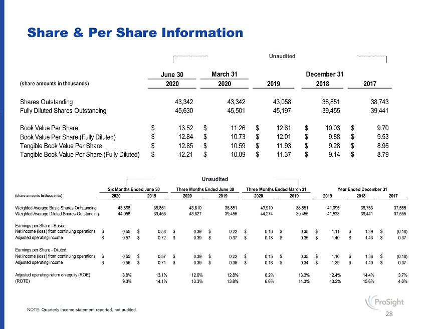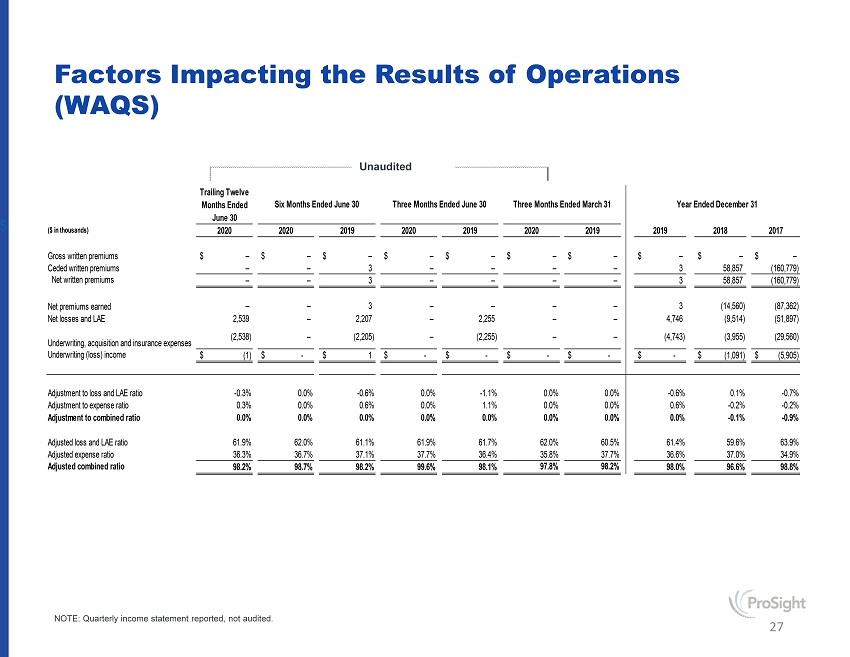 Trailing Twelve Months Ended June 30 ($ in thousands) 2020 2020 2019 2020 2019 2020 2019 2019 2018 2017 Gross written premiums –$ –$ –$ –$ –$ –$ –$ –$ –$ –$ Ceded written premiums – – 3 – – – – 3 58,857 (160,779) Net written premiums – – 3 – – – – 3 58,857 (160,779) Net premiums earned – – 3 – – – – 3 (14,560) (87,362) Net losses and LAE 2,539 – 2,207 – 2,255 – – 4,746 (9,514) (51,897) Underwriting, acquisition and insurance expenses (2,538) – (2,205) – (2,255) – – (4,743) (3,955) (29,560) Underwriting (loss) income (1)$ -$ 1$ -$ -$ -$ -$ -$ (1,091)$ (5,905)$ Adjustment to loss and LAE ratio -0.3% 0.0% -0.6% 0.0% -1.1% 0.0% 0.0% -0.6% 0.1% -0.7% Adjustment to expense ratio 0.3% 0.0% 0.6% 0.0% 1.1% 0.0% 0.0% 0.6% -0.2% -0.2% Adjustment to combined ratio 0.0% 0.0% 0.0% 0.0% 0.0% 0.0% 0.0% 0.0% -0.1% -0.9% Adjusted loss and LAE ratio 61.9% 62.0% 61.1% 61.9% 61.7% 62.0% 60.5% 61.4% 59.6% 63.9% Adjusted expense ratio 36.3% 36.7% 37.1% 37.7% 36.4% 35.8% 37.7% 36.6% 37.0% 34.9% Adjusted combined ratio 98.2% 98.7% 98.2% 99.6% 98.1% 97.8% 98.2% 98.0% 96.6% 98.8% Three Months Ended June 30Six Months Ended June 30 Three Months Ended March 31 Year Ended December 31 27 Factors Impacting the Results of Operations (WAQS) NOTE: Quarterly income statement reported, not audited. Unaudited