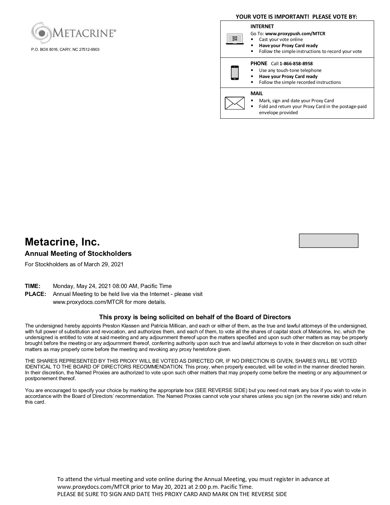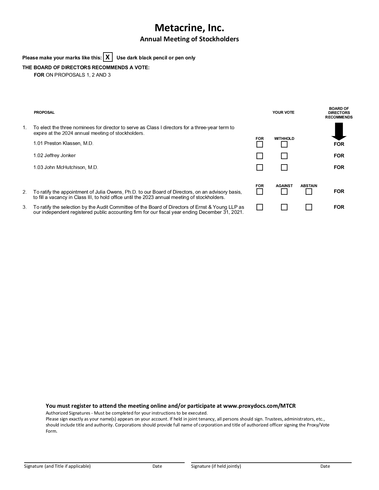 YOUR VOTE IS IMPORTANT! PLEASE VOTE BY: Metacrine, Inc. Annual Meeting of Stockholders For Stockholders as of March 29, 2021 TIME: Monday, May 24, 2021 08:00 AM, Pacific Time PLACE: Annual Meeting to be held live via the Internet - please visit www.proxydocs.com/MTCR for more details. This proxy is being solicited on behalf of the Board of Directors The undersigned hereby appoints Preston Klassen and Patricia Millican, and each or either of them, as the true and lawful attorneys of the undersigned, with full power of substitution and revocation, and authorizes them, and each of them, to vote all the shares of capital stock of Metacrine, Inc. which the undersigned is entitled to vote at said meeting and any adjournment thereof upon the matters specified and upon such other matters as may be properly brought before the meeting or any adjournment thereof, conferring authority upon such true and lawful attorneys to vote in their discretion on such other matters as may properly come before the meeting and revoking any proxy heretofore given. THE SHARES REPRESENTED BY THIS PROXY WILL BE VOTED AS DIRECTED OR, IF NO DIRECTION IS GIVEN, SHARES WILL BE VOTED IDENTICAL TO THE BOARD OF DIRECTORS RECOMMENDATION. This proxy, when properly executed, will be voted in the manner directed herein. In their discretion, the Named Proxies are authorized to vote upon such other matters that may properly come before the meeting or any adjournment or postponement thereof. You are encouraged to specify your choice by marking the appropriate box (SEE REVERSE SIDE) but you need not mark any box if you wish to vote in accordance with the Board of Directors’ recommendation. The Named Proxies cannot vote your shares unless you sign (on the reverse side) and return this card. To attend the virtual meeting and vote online during the Annual Meeting, you must register in advance at www.proxydocs.com/MTCR prior to May 20, 2021 at 2:00 p.m. Pacific Time. PLEASE BE SURE TO SIGN AND DATE THIS PROXY CARD AND MARK ON THE REVERSE SIDE P.O. BOX 8016, CARY, NC 27512-9903 INTERNET Go To: www.proxypush.com/MTCR • Cast your vote online • Have your Proxy Card ready • Follow the simple instructions to record your vote PHONE Call 1-866-858-8958 • Use any touch-tone telephone • Have your Proxy Card ready • Follow the simple recorded instructions MAIL • Mark, sign and date your Proxy Card • Fold and return your Proxy Card in the postage-paid envelope provided