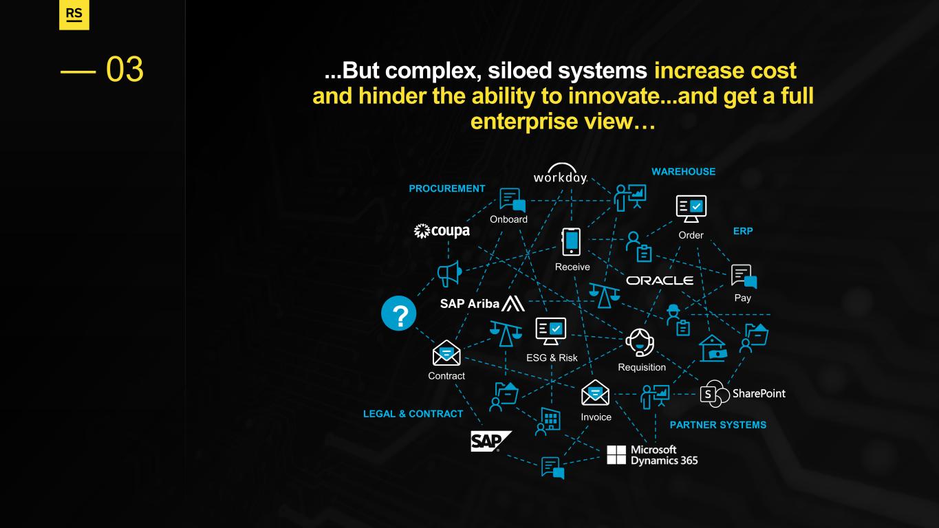 ? LEGAL & CONTRACT Contract Onboard Requisition Order Receive Invoice Pay ESG & Risk PARTNER SYSTEMS PROCUREMENT ERP WAREHOUSE — 02 ...And boards also want everything... "Cloud, AI, Digital Transformation…" while cutting IT Budgets to improve profits...