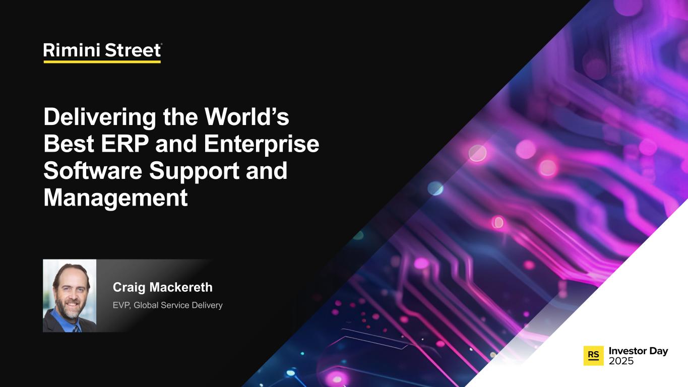 PROPERTY OF RIMINI STREET ©2025 | PROPRIETARY AND CONFIDENTIAL A global provider of end-to-end enterprise software support, products and services Rimini Street: Act I (2005 – 2025) 28% 19% 23% 12% 12% 6%Manufacturing TMT Services Public Sector & Education Healthcare & Retail Distribution & Transportation 47% 29% 17% 7% APAC EMEA Other (1) U.S. Revenue by Industry Revenue by Geography2 As of September 30, 2025 (1) AMERICAS excluding. U.S. Founded: 2005 Public: Nasdaq: RMNI Global Headquarters: Las Vegas, NV USA Employees: 2,000+ Signed Clients: 6,300+ (includes 200+ Fortune 500 / Global 100) Avg Case Client Sat: 4.9 out of 5.0 Global Reach: 21 countries of operation, supporting clients in 160+ countries Gross Margin: 60%+ Supported Products and Services PROFESSIONAL SERVICES AND SOLUTIONSMANAGED SERVICESSUPPORT SERVICES Strategic roadmaps, Composable ERP, ERP modernization, Custom solutions, Cloud migrations, Database migrations, Security assessments, Rimini solution implementations, Licensing advisory, Health checks, Skills augmentation REVENUE PROFILE