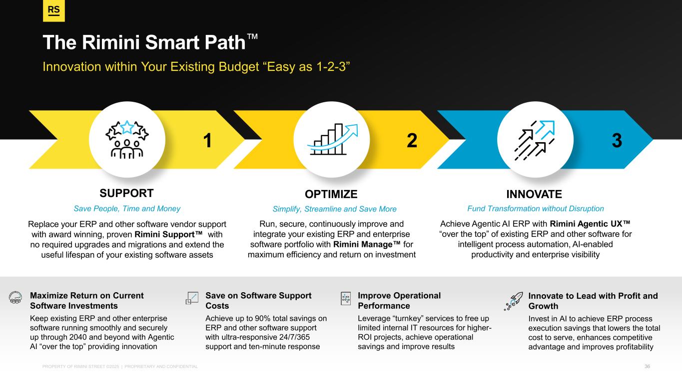 PROPERTY OF RIMINI STREET ©2025 | PROPRIETARY AND CONFIDENTIAL Innovation within Your Existing Budget “Easy as 1-2-3” The Rimini Smart Path REVENUE SHARE* ~87% REVENUE SHARE* ~13% REVENUE SHARE* Accretive for 2026+ SUPPORT OPTIMIZE INNOVATE Save People, Time and Money Simplify, Streamline and Save More Fund Transformation without Disruption 1 32 Maximize Return on Current Software Investments Keep existing ERP and other enterprise software running smoothly and securely up through 2040 and beyond with Agentic AI “over the top” providing innovation Save on Software Support Costs Achieve up to 90% total savings on ERP and other software support with ultra-responsive 24/7/365 support and ten-minute response Improve Operational Performance Leverage “turnkey” services to free up limited internal IT resources for higher- ROI projects, achieve operational savings and improve results Innovate to Lead with Profit and Growth Invest in AI to achieve ERP process execution savings that lowers the total cost to serve, enhances competitive advantage and improves profitability 93 *Trailing 12 months as of September 30, 2025