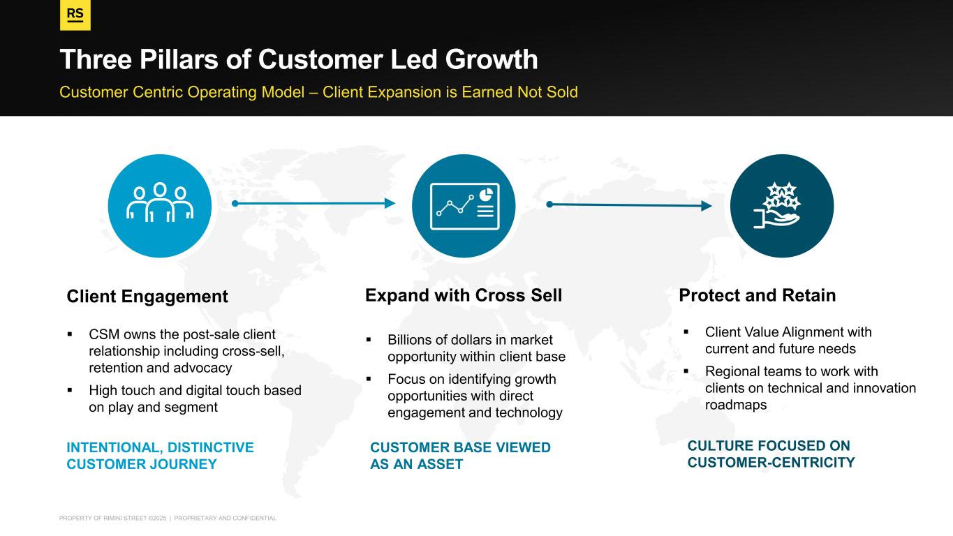 PROPERTY OF RIMINI STREET ©2025 | PROPRIETARY AND CONFIDENTIAL Client Engagement Strategy STRATEGIC Clients – 4% Revenue 31% ENTERPRISE Clients ~24% Revenue ~45% PREMIER Clients ~13% Revenue ~10% COMMERCIAL Clients ~58% Revenue ~14% ENGAGE ADVOCATE RENEW ONBOARDING EXPANDATTRACT Segmentation Deliberate Customer Experience ▪ Client segmentation criteria – simple, regionally driven based on existing and potential revenue, assigned by industry expertise ▪ High touch and Hybrid customer engagement models ▪ Strategic client engagement model named executive sponsors, custom approach, high touch ▪ Framing the customer journey through value ▪ Customer defined value at the core, CSM partners to identify evidence of quantifiable outcomes and ROI ▪ Leveraging new technologies to drive customer satisfaction, retention, cross-sell, and share of wallet Value Measures Defined Quantifiable Business Outcomes