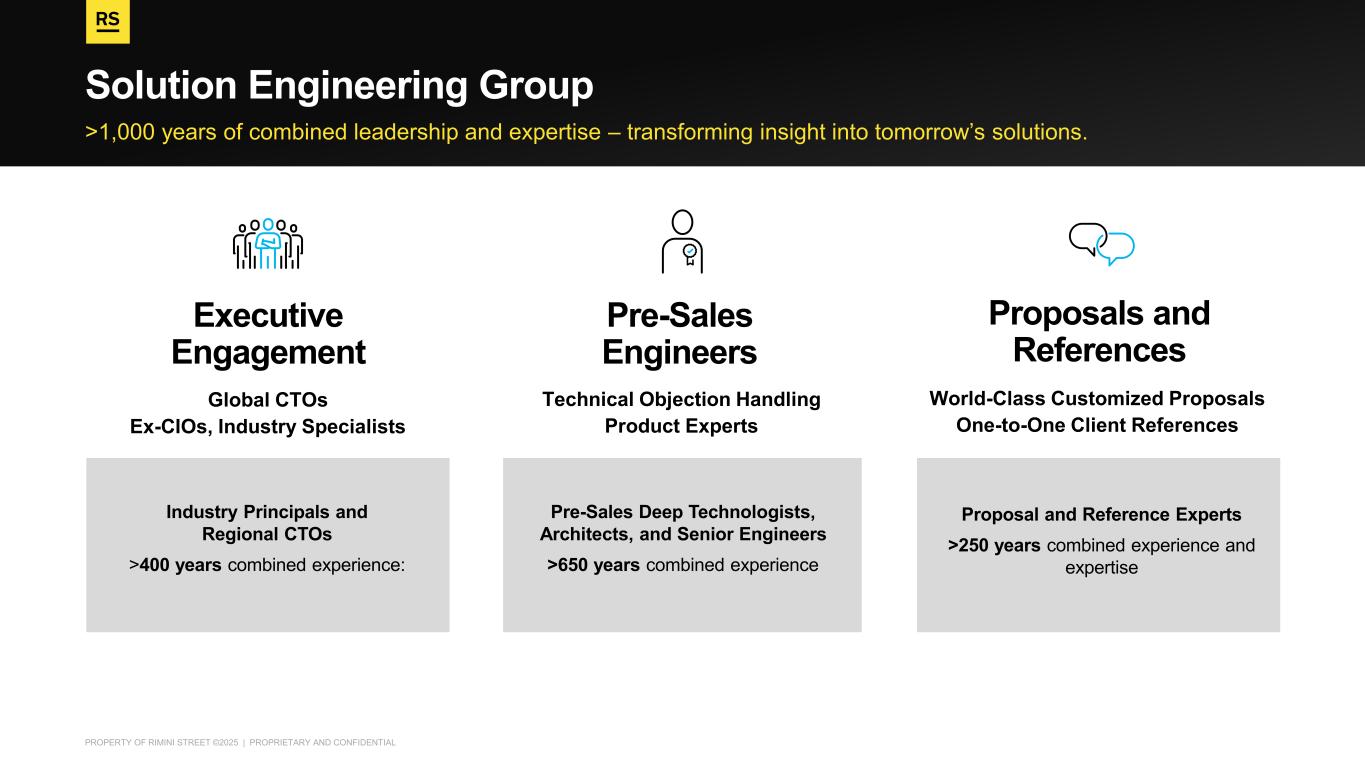 PROPERTY OF RIMINI STREET ©2025 | PROPRIETARY AND CONFIDENTIAL >1,000 years of combined leadership and expertise – transforming insight into tomorrow’s solutions. Solution Engineering Group Industry Principals and Regional CTOs >400 years combined experience: Pre-Sales Deep Technologists, Architects, and Senior Engineers >650 years combined experience Proposal and Reference Experts >250 years combined experience and expertise Global CTOs Ex-CIOs, Industry Specialists Executive Engagement Technical Objection Handling Product Experts Pre-Sales Engineers World-Class Customized Proposals One-to-One Client References Proposals and References