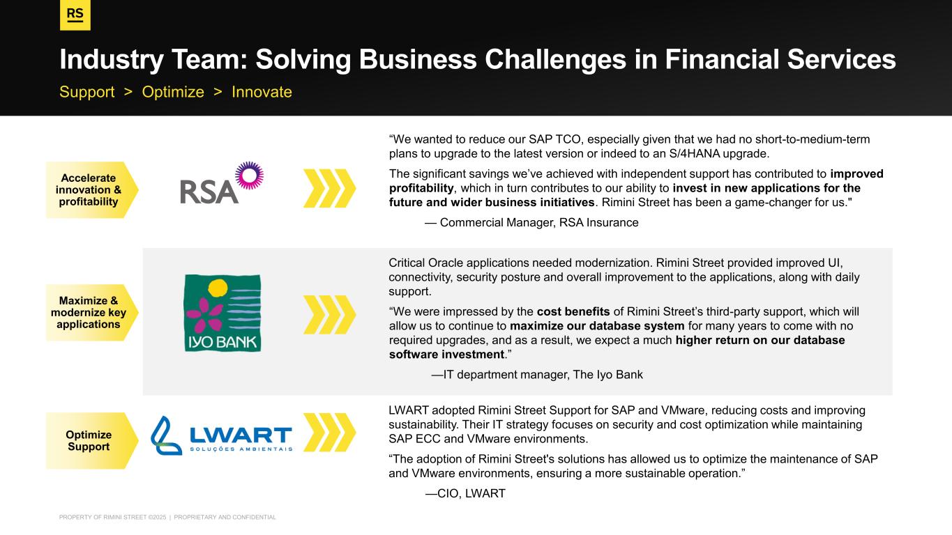 PROPERTY OF RIMINI STREET ©2025 | PROPRIETARY AND CONFIDENTIAL Support > Optimize > Innovate Industry Team: Solving Business Challenges in Financial Services “We wanted to reduce our SAP TCO, especially given that we had no short-to-medium-term plans to upgrade to the latest version or indeed to an S/4HANA upgrade. The significant savings we’ve achieved with independent support has contributed to improved profitability, which in turn contributes to our ability to invest in new applications for the future and wider business initiatives. Rimini Street has been a game-changer for us." — Commercial Manager, RSA Insurance Critical Oracle applications needed modernization. Rimini Street provided improved UI, connectivity, security posture and overall improvement to the applications, along with daily support. “We were impressed by the cost benefits of Rimini Street’s third-party support, which will allow us to continue to maximize our database system for many years to come with no required upgrades, and as a result, we expect a much higher return on our database software investment.” —IT department manager, The Iyo Bank LWART adopted Rimini Street Support for SAP and VMware, reducing costs and improving sustainability. Their IT strategy focuses on security and cost optimization while maintaining SAP ECC and VMware environments. “The adoption of Rimini Street's solutions has allowed us to optimize the maintenance of SAP and VMware environments, ensuring a more sustainable operation.” —CIO, LWART Optimize Support Accelerate innovation & profitability Maximize & modernize key applications