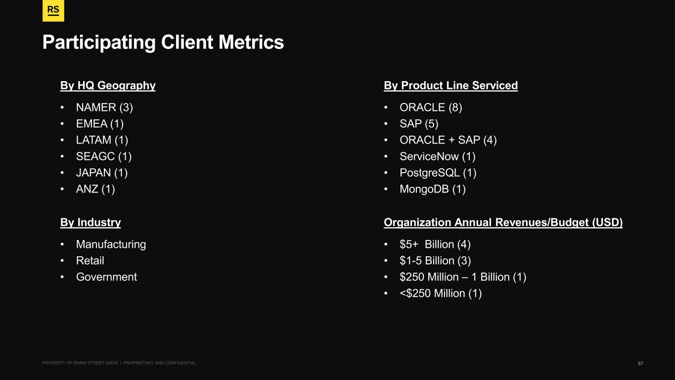 PROPERTY OF RIMINI STREET ©2025 | PROPRIETARY AND CONFIDENTIAL Support Roadmap Long-term land, expand and LTV expansion case study Supporting Hyundai’s Strategic Roadmap 2020 2021 20222019 37 subsidiaries across, 7 industries | 2019 → 2025 2025 Hyundai Autoever brings their Oracle Technology and Database support to Rimini Street from South Korea Product expansion for Siebel and global expansion with Hyundai subsidiaries Global expansion continues with additional subsidiaries signing with Rimini Street Product expansion for SAP Product expansion for Oracle EBS, MariaDB, MySQL and PostgreSQL for Hyundai Steel Expansion into KIA Motors Cost Savings & Desire for Better Support Drivers for Switch to Rimini Street • Reinvest savings for cutting edge areas in digital innovation • Started with a proof of concept and quickly expanded across global regions including North America, Brazil , Mexico, Europe, Czech, Slovakia, Turkey, and India Tens of millions ($) savings for Hyundai to reinvest and lower bottom- line costs by switching to Rimini Street