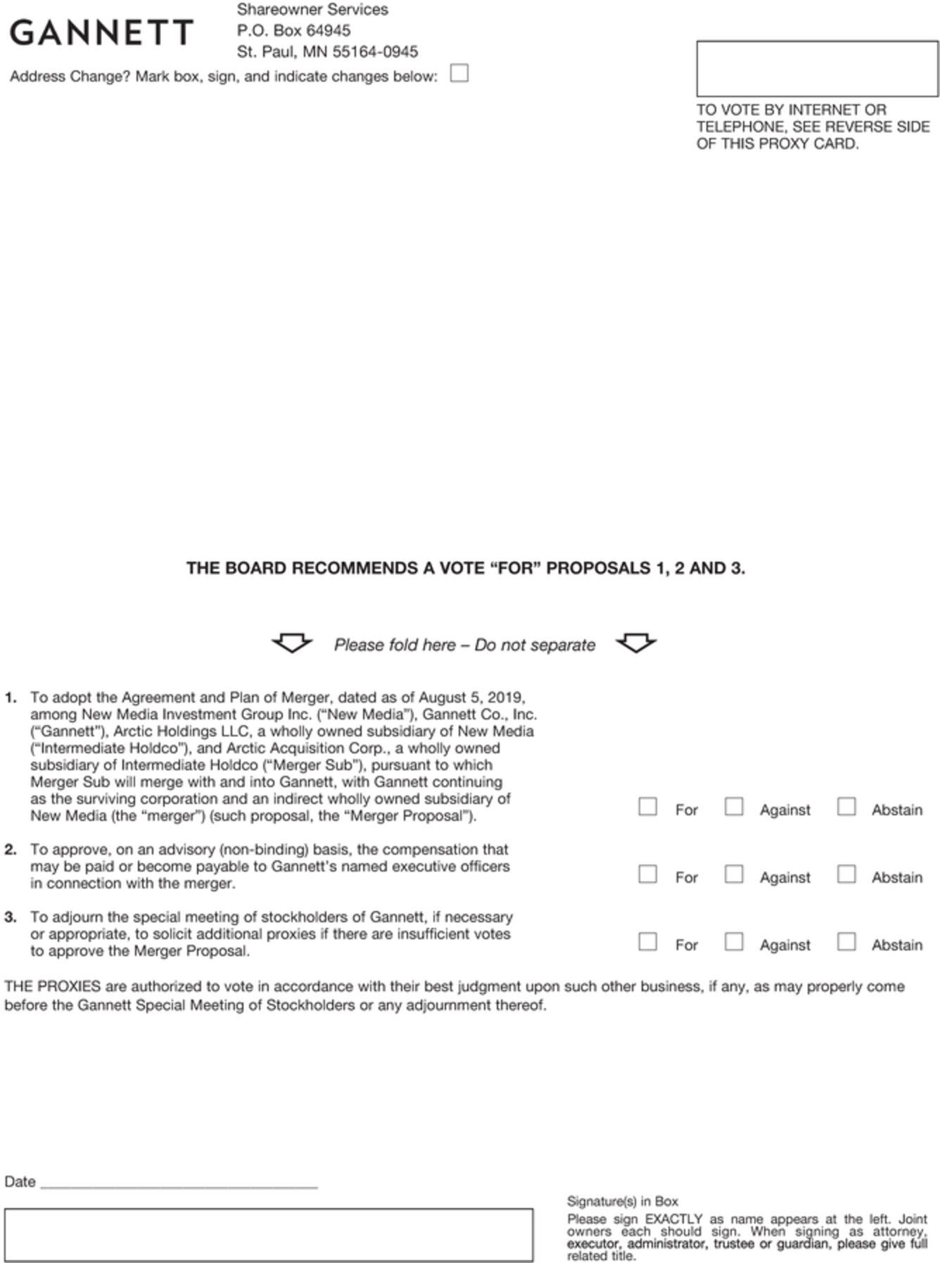 At the special meeting of Gannett stockholders (the “Gannett special meeting”), Gannett stockholders will be asked to vote on (1) a proposal to adopt the merger agreement (the “Merger Proposal”), (2) a proposal to approve, on an advisory (non-binding) basis, the compensation that may be paid or become payable to Gannett’s named executive officers in connection with the merger (the “Compensation Proposal”) and (3) a proposal to adjourn the Gannett special meeting, if necessary or appropriate, to solicit additional proxies if there are not sufficient votes to approve the Merger Proposal (the “Gannett Adjournment Proposal”).