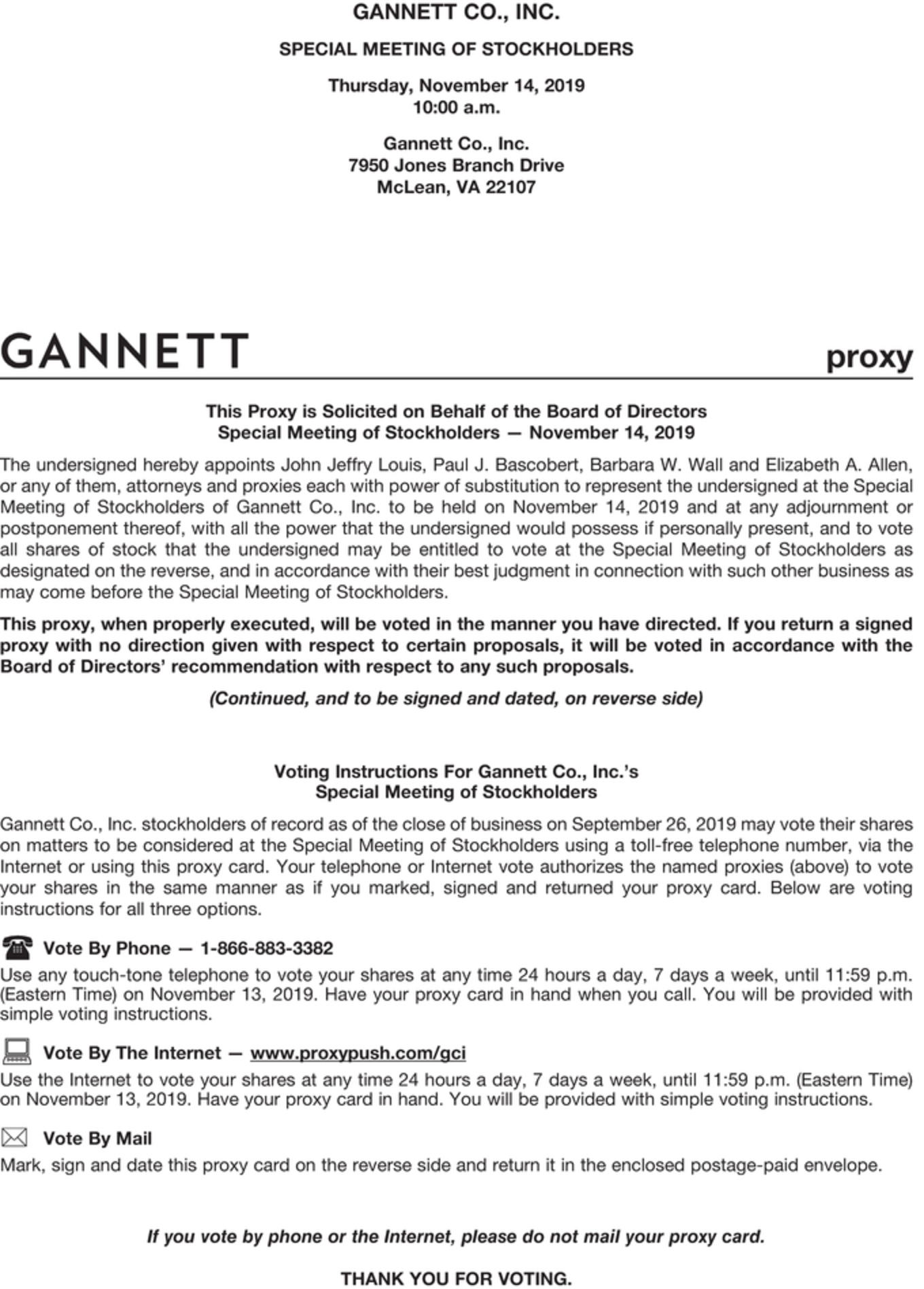 We are pleased to invite you to attend the special meeting of stockholders (the “Gannett special meeting”) of Gannett Co., Inc., a Delaware corporation (“Gannett”), which will be held at Gannett's headquarters, located at 7950 Jones Branch Drive, McLean, Virginia 22107 on November 14, 2019 at 10:00 a.m., local time, to consider and vote on the following proposals: