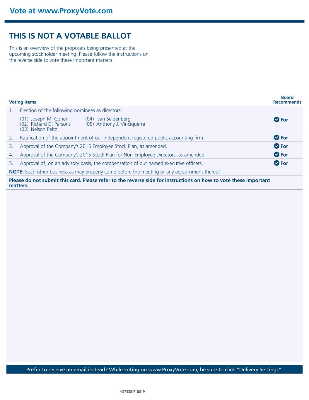 Vote at www.ProxyVote.com Prefer to receive an email instead? While voting on www.ProxyVote.com, be sure to click “Delivery Settings”. Voting Items Board Recommends V57538-P18619 THIS IS NOT A VOTABLE BALLOT This is an overview of the proposals being presented at the upcoming stockholder meeting. Please follow the instructions on the reverse side to vote these important matters. 1. Election of the following nominees as directors: For(01) Joseph M. Cohen (02) Richard D. Parsons (03) Nelson Peltz (04) Ivan Seidenberg (05) Anthony J. Vinciquerra 2. Ratification of the appointment of our independent registered public accounting firm. For 3. Approval of the Company’s 2015 Employee Stock Plan, as amended. For 4. Approval of the Company’s 2015 Stock Plan for Non-Employee Directors, as amended. For 5. Approval of, on an advisory basis, the compensation of our named executive officers. For NOTE: Such other business as may properly come before the meeting or any adjournment thereof. Please do not submit this card. Please refer to the reverse side for instructions on how to vote these important matters.