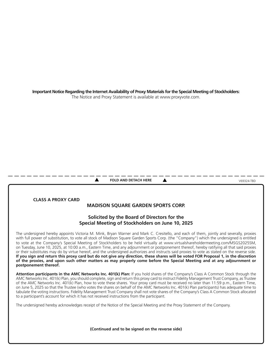V69324-TBD Important Notice Regarding the Internet Availability of Proxy Materials for the Special Meeting of Stockholders: The Notice and Proxy Statement is available at www.proxyvote.com. CLASS A PROXY CARD MADISON SQUARE GARDEN SPORTS CORP. Solicited by the Board of Directors for the Special Meeting of Stockholders on June 10, 2025 The undersigned hereby appoints Victoria M. Mink, Bryan Warner and Mark C. Cresitello, and each of them, jointly and severally, proxies with full power of substitution, to vote all stock of Madison Square Garden Sports Corp. (the "Company") which the undersigned is entitled to vote at the Company’s Special Meeting of Stockholders to be held virtually at www.virtualshareholdermeeting.com/MSGS2025SM, on Tuesday, June 10, 2025, at 10:00 a.m., Eastern Time, and any adjournment or postponement thereof, hereby ratifying all that said proxies or their substitutes may do by virtue hereof, and the undersigned authorizes and instructs said proxies to vote as stated on the reverse side. If you sign and return this proxy card but do not give any direction, these shares will be voted FOR Proposal 1, in the discretion of the proxies, and upon such other matters as may properly come before the Special Meeting and at any adjournment or postponement thereof. Attention participants in the AMC Networks Inc. 401(k) Plan: If you hold shares of the Company’s Class A Common Stock through the AMC Networks Inc. 401(k) Plan, you should complete, sign and return this proxy card to instruct Fidelity Management Trust Company, as Trustee of the AMC Networks Inc. 401(k) Plan, how to vote these shares. Your proxy card must be received no later than 11:59 p.m., Eastern Time, on June 5, 2025 so that the Trustee (who votes the shares on behalf of the AMC Networks Inc. 401(k) Plan participants) has adequate time to tabulate the voting instructions. Fidelity Management Trust Company shall not vote shares of the Company’s Class A Common Stock allocated to a participant’s account for which it has not received instructions from the participant. The undersigned hereby acknowledges receipt of the Notice of the Special Meeting and the Proxy Statement of the Company. (Continued and to be signed on the reverse side) FOLD AND DETACH HERE