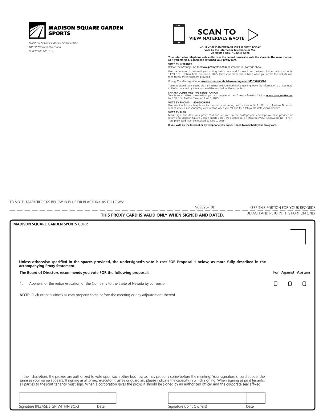 Signature [PLEASE SIGN WITHIN BOX] Date Signature (Joint Owners) Date TO VOTE, MARK BLOCKS BELOW IN BLUE OR BLACK INK AS FOLLOWS: KEEP THIS PORTION FOR YOUR RECORDS DETACH AND RETURN THIS PORTION ONLYTHIS PROXY CARD IS VALID ONLY WHEN SIGNED AND DATED. V69325-TBD For Against Abstain ! !! MADISON SQUARE GARDEN SPORTS CORP. TWO PENNSYLVANIA PLAZA NEW YORK, NY 10121 MADISON SQUARE GARDEN SPORTS CORP. Unless otherwise specified in the spaces provided, the undersigned’s vote is cast FOR Proposal 1 below, as more fully described in the accompanying Proxy Statement. The Board of Directors recommends you vote FOR the following proposal: 1. Approval of the redomestication of the Company to the State of Nevada by conversion. In their discretion, the proxies are authorized to vote upon such other business as may properly come before the meeting. Your signature should appear the same as your name appears. If signing as attorney, executor, trustee or guardian, please indicate the capacity in which signing. When signing as joint tenants, all parties to the joint tenancy must sign. When a corporation gives the proxy, it should be signed by an authorized officer and the corporate seal affixed. NOTE: Such other business as may properly come before the meeting or any adjournment thereof. YOUR VOTE IS IMPORTANT, PLEASE VOTE TODAY. Vote by the Internet or Telephone or Mail 24 Hours a Day, 7 Days a Week Your Internet or telephone vote authorizes the named proxies to vote the shares in the same manner as if you marked, signed and returned your proxy card. VOTE BY INTERNET Before The Meeting - Go to www.proxyvote.com or scan the QR barcode above. Use the Internet to transmit your voting instructions and for electronic delivery of information up until 11:59 p.m., Eastern Time, on June 9, 2025. Have your proxy card in hand when you access the website and then follow the instructions provided. During The Meeting - Go to www.virtualshareholdermeeting.com/MSGS2025SM You may attend the meeting via the Internet and vote during the meeting. Have the information that is printed in the box marked by the arrow available and follow the instructions. SHAREHOLDER MEETING REGISTRATION To vote and/or attend the meeting, you must register at the "Attend a Meeting" link at www.proxyvote.com by 5:00 p.m., Eastern Time, on June 5, 2025. VOTE BY PHONE - 1-800-690-6903 Use any touch-tone telephone to transmit your voting instructions until 11:59 p.m., Eastern Time, on June 9, 2025. Have your proxy card in hand when you call and then follow the instructions provided. VOTE BY MAIL Mark, sign, and date your proxy card and return it in the postage-paid envelope we have provided or return it to Madison Square Garden Sports Corp., c/o Broadridge, 51 Mercedes Way, Edgewood, NY 11717. Your proxy card must be received by June 9, 2025. If you vote by the Internet or by telephone you do NOT need to mail back your proxy card. SCAN TO VIEW MATERIALS & VOTEw