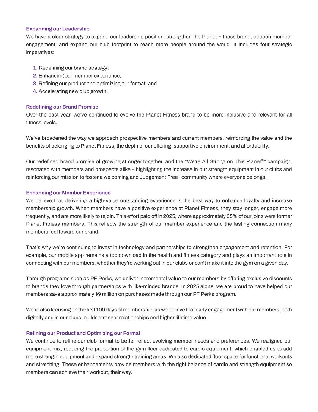 Expanding our Leadership We have a clear strategy to expand our leadership position: strengthen the Planet Fitness brand, deepen member engagement, and expand our club footprint to reach more people around the world. It includes four strategic imperatives: 1. Redefining our brand strategy; 2. Enhancing our member experience; 3. Refining our product and optimizing our format; and 4. Accelerating new club growth. Redefining our Brand Promise Over the past year, we’ve continued to evolve the Planet Fitness brand to be more inclusive and relevant for all fitness levels. We’ve broadened the way we approach prospective members and current members, reinforcing the value and the benefits of belonging to Planet Fitness, the depth of our offering, supportive environment, and affordability. Our redefined brand promise of growing stronger together, and the “We’re All Strong on This Planet™” campaign, resonated with members and prospects alike – highlighting the increase in our strength equipment in our clubs and reinforcing our mission to foster a welcoming and Judgement Free™ community where everyone belongs. Enhancing our Member Experience We believe that delivering a high-value outstanding experience is the best way to enhance loyalty and increase membership growth. When members have a positive experience at Planet Fitness, they stay longer, engage more frequently, and are more likely to rejoin. This effort paid off in 2025, where approximately 35% of our joins were former Planet Fitness members. This reflects the strength of our member experience and the lasting connection many members feel toward our brand. That’s why we’re continuing to invest in technology and partnerships to strengthen engagement and retention. For example, our mobile app remains a top download in the health and fitness category and plays an important role in connecting with our members, whether they’re working out in our clubs or can’t make it into the gym on a given day. Through programs such as PF Perks, we deliver incremental value to our members by offering exclusive discounts to brands they love through partnerships with like-minded brands. In 2025 alone, we are proud to have helped our members save approximately $9 million on purchases made through our PF Perks program. We’re also focusing on the first 100 days of membership, as we believe that early engagement with our members, both digitally and in our clubs, builds stronger relationships and higher lifetime value. Refining our Product and Optimizing our Format We continue to refine our club format to better reflect evolving member needs and preferences. We realigned our equipment mix, reducing the proportion of the gym floor dedicated to cardio equipment, which enabled us to add more strength equipment and expand strength training areas. We also dedicated floor space for functional workouts and stretching. These enhancements provide members with the right balance of cardio and strength equipment so members can achieve their workout, their way.