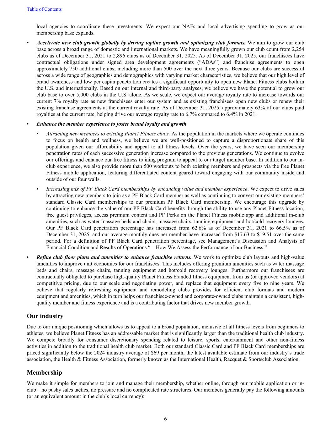 local agencies to coordinate these investments. We expect our NAFs and local advertising spending to grow as our membership base expands. • Accelerate new club growth globally by driving topline growth and optimizing club formats. We aim to grow our club base across a broad range of domestic and international markets. We have meaningfully grown our club count from 2,254 clubs as of December 31, 2021 to 2,896 clubs as of December 31, 2025. As of December 31, 2025, our franchisees have contractual obligations under signed area development agreements (“ADAs”) and franchise agreements to open approximately 750 additional clubs, including more than 500 over the next three years. Because our clubs are successful across a wide range of geographies and demographics with varying market characteristics, we believe that our high level of brand awareness and low per capita penetration creates a significant opportunity to open new Planet Fitness clubs both in the U.S. and internationally. Based on our internal and third-party analyses, we believe we have the potential to grow our club base to over 5,000 clubs in the U.S. alone. As we scale, we expect our average royalty rate to increase towards our current 7% royalty rate as new franchisees enter our system and as existing franchisees open new clubs or renew their existing franchise agreements at the current royalty rate. As of December 31, 2025, approximately 63% of our clubs paid royalties at the current rate, helping drive our average royalty rate to 6.7% compared to 6.4% in 2021. • Enhance the member experience to foster brand loyalty and growth • Attracting new members to existing Planet Fitness clubs. As the population in the markets where we operate continues to focus on health and wellness, we believe we are well-positioned to capture a disproportionate share of this population given our affordability and appeal to all fitness levels. Over the years, we have seen our membership penetration rates of each successive generation increase compared to the previous generations. We continue to evolve our offerings and enhance our free fitness training program to appeal to our target member base. In addition to our in- club experience, we also provide more than 500 workouts to both existing members and prospects via the free Planet Fitness mobile application, featuring differentiated content geared toward engaging with our community inside and outside of our four walls. • Increasing mix of PF Black Card memberships by enhancing value and member experience. We expect to drive sales by attracting new members to join as a PF Black Card member as well as continuing to convert our existing members’ standard Classic Card memberships to our premium PF Black Card membership. We encourage this upgrade by continuing to enhance the value of our PF Black Card benefits through the ability to use any Planet Fitness location, free guest privileges, access premium content and PF Perks on the Planet Fitness mobile app and additional in-club amenities, such as water massage beds and chairs, massage chairs, tanning equipment and hot/cold recovery lounges. Our PF Black Card penetration percentage has increased from 62.6% as of December 31, 2021 to 66.5% as of December 31, 2025, and our average monthly dues per member have increased from $17.63 to $19.51 over the same period. For a definition of PF Black Card penetration percentage, see Management’s Discussion and Analysis of Financial Condition and Results of Operations.“—How We Assess the Performance of our Business.” • Refine club floor plans and amenities to enhance franchise returns. We work to optimize club layouts and high-value amenities to improve unit economics for our franchisees. This includes offering premium amenities such as water massage beds and chairs, massage chairs, tanning equipment and hot/cold recovery lounges. Furthermore our franchisees are contractually obligated to purchase high-quality Planet Fitness branded fitness equipment from us (or approved vendors) at competitive pricing, due to our scale and negotiating power, and replace that equipment every five to nine years. We believe that regularly refreshing equipment and remodeling clubs provides for efficient club formats and modern equipment and amenities, which in turn helps our franchisee-owned and corporate-owned clubs maintain a consistent, high- quality member and fitness experience and is a contributing factor that drives new member growth. Our industry Due to our unique positioning which allows us to appeal to a broad population, inclusive of all fitness levels from beginners to athletes, we believe Planet Fitness has an addressable market that is significantly larger than the traditional health club industry. We compete broadly for consumer discretionary spending related to leisure, sports, entertainment and other non-fitness activities in addition to the traditional health club market. Both our standard Classic Card and PF Black Card memberships are priced significantly below the 2024 industry average of $69 per month, the latest available estimate from our industry’s trade association, the Health & Fitness Association, formerly known as the International Health, Racquet & Sportsclub Association. Membership We make it simple for members to join and manage their membership, whether online, through our mobile application or in- club—no pushy sales tactics, no pressure and no complicated rate structures. Our members generally pay the following amounts (or an equivalent amount in the club’s local currency): Table of Contents 6
