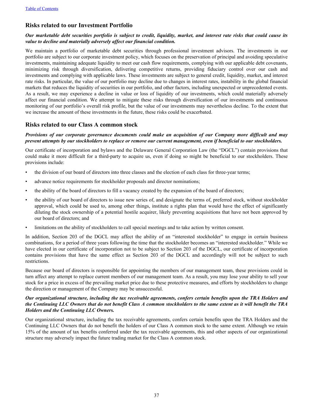 Risks related to our Investment Portfolio Our marketable debt securities portfolio is subject to credit, liquidity, market, and interest rate risks that could cause its value to decline and materially adversely affect our financial condition. We maintain a portfolio of marketable debt securities through professional investment advisors. The investments in our portfolio are subject to our corporate investment policy, which focuses on the preservation of principal and avoiding speculative investments, maintaining adequate liquidity to meet our cash flow requirements, complying with our applicable debt covenants, minimizing risk through diversification, delivering competitive returns, providing fiduciary control over our cash and investments and complying with applicable laws. These investments are subject to general credit, liquidity, market, and interest rate risks. In particular, the value of our portfolio may decline due to changes in interest rates, instability in the global financial markets that reduces the liquidity of securities in our portfolio, and other factors, including unexpected or unprecedented events. As a result, we may experience a decline in value or loss of liquidity of our investments, which could materially adversely affect our financial condition. We attempt to mitigate these risks through diversification of our investments and continuous monitoring of our portfolio’s overall risk profile, but the value of our investments may nevertheless decline. To the extent that we increase the amount of these investments in the future, these risks could be exacerbated. Risks related to our Class A common stock Provisions of our corporate governance documents could make an acquisition of our Company more difficult and may prevent attempts by our stockholders to replace or remove our current management, even if beneficial to our stockholders. Our certificate of incorporation and bylaws and the Delaware General Corporation Law (the “DGCL”) contain provisions that could make it more difficult for a third-party to acquire us, even if doing so might be beneficial to our stockholders. These provisions include: • the division of our board of directors into three classes and the election of each class for three-year terms; • advance notice requirements for stockholder proposals and director nominations; • the ability of the board of directors to fill a vacancy created by the expansion of the board of directors; • the ability of our board of directors to issue new series of, and designate the terms of, preferred stock, without stockholder approval, which could be used to, among other things, institute a rights plan that would have the effect of significantly diluting the stock ownership of a potential hostile acquirer, likely preventing acquisitions that have not been approved by our board of directors; and • limitations on the ability of stockholders to call special meetings and to take action by written consent. In addition, Section 203 of the DGCL may affect the ability of an “interested stockholder” to engage in certain business combinations, for a period of three years following the time that the stockholder becomes an “interested stockholder.” While we have elected in our certificate of incorporation not to be subject to Section 203 of the DGCL, our certificate of incorporation contains provisions that have the same effect as Section 203 of the DGCL and accordingly will not be subject to such restrictions. Because our board of directors is responsible for appointing the members of our management team, these provisions could in turn affect any attempt to replace current members of our management team. As a result, you may lose your ability to sell your stock for a price in excess of the prevailing market price due to these protective measures, and efforts by stockholders to change the direction or management of the Company may be unsuccessful. Our organizational structure, including the tax receivable agreements, confers certain benefits upon the TRA Holders and the Continuing LLC Owners that do not benefit Class A common stockholders to the same extent as it will benefit the TRA Holders and the Continuing LLC Owners. Our organizational structure, including the tax receivable agreements, confers certain benefits upon the TRA Holders and the Continuing LLC Owners that do not benefit the holders of our Class A common stock to the same extent. Although we retain 15% of the amount of tax benefits conferred under the tax receivable agreements, this and other aspects of our organizational structure may adversely impact the future trading market for the Class A common stock. Table of Contents 37