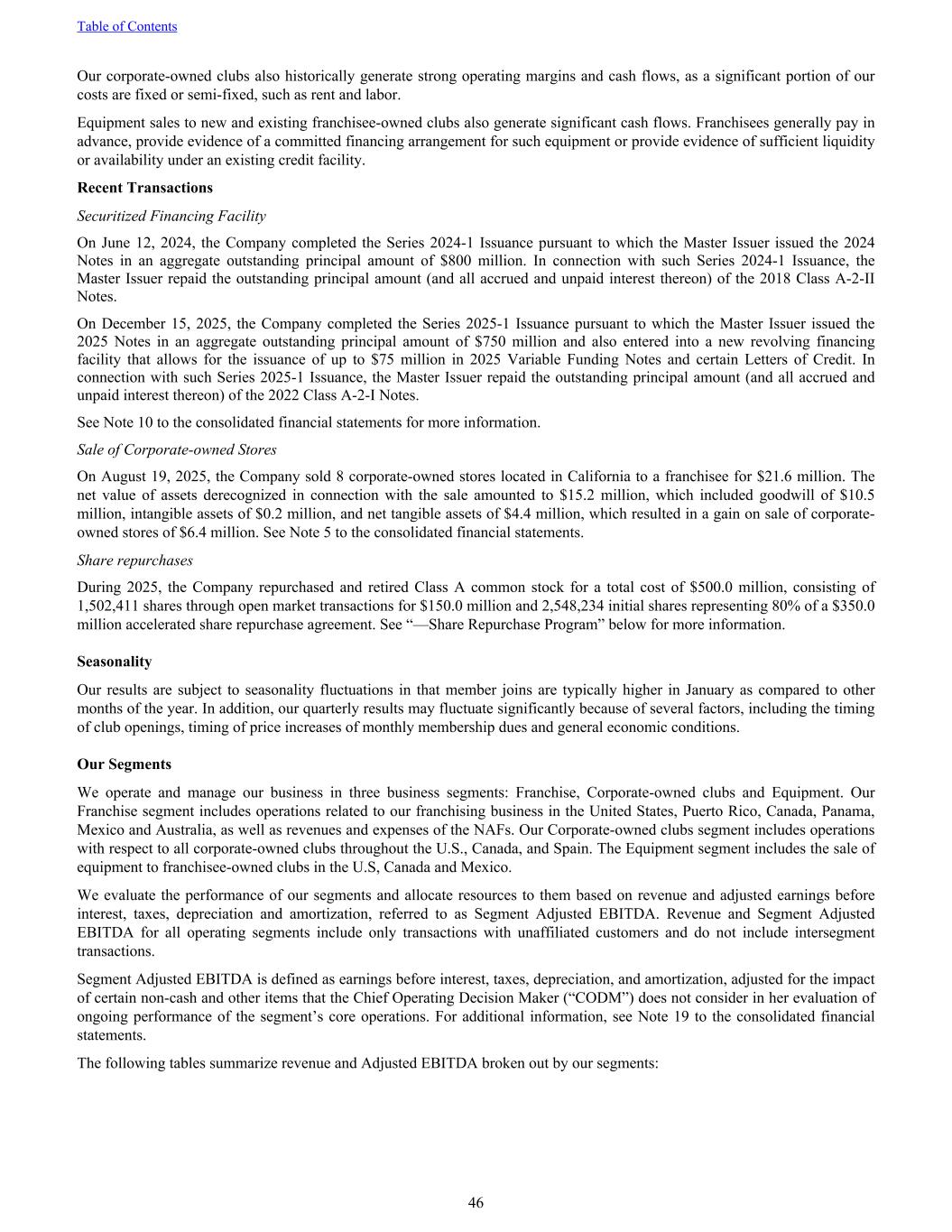 Our corporate-owned clubs also historically generate strong operating margins and cash flows, as a significant portion of our costs are fixed or semi-fixed, such as rent and labor. Equipment sales to new and existing franchisee-owned clubs also generate significant cash flows. Franchisees generally pay in advance, provide evidence of a committed financing arrangement for such equipment or provide evidence of sufficient liquidity or availability under an existing credit facility. Recent Transactions Securitized Financing Facility On June 12, 2024, the Company completed the Series 2024-1 Issuance pursuant to which the Master Issuer issued the 2024 Notes in an aggregate outstanding principal amount of $800 million. In connection with such Series 2024-1 Issuance, the Master Issuer repaid the outstanding principal amount (and all accrued and unpaid interest thereon) of the 2018 Class A-2-II Notes. On December 15, 2025, the Company completed the Series 2025-1 Issuance pursuant to which the Master Issuer issued the 2025 Notes in an aggregate outstanding principal amount of $750 million and also entered into a new revolving financing facility that allows for the issuance of up to $75 million in 2025 Variable Funding Notes and certain Letters of Credit. In connection with such Series 2025-1 Issuance, the Master Issuer repaid the outstanding principal amount (and all accrued and unpaid interest thereon) of the 2022 Class A-2-I Notes. See Note 10 to the consolidated financial statements for more information. Sale of Corporate-owned Stores On August 19, 2025, the Company sold 8 corporate-owned stores located in California to a franchisee for $21.6 million. The net value of assets derecognized in connection with the sale amounted to $15.2 million, which included goodwill of $10.5 million, intangible assets of $0.2 million, and net tangible assets of $4.4 million, which resulted in a gain on sale of corporate- owned stores of $6.4 million. See Note 5 to the consolidated financial statements. Share repurchases During 2025, the Company repurchased and retired Class A common stock for a total cost of $500.0 million, consisting of 1,502,411 shares through open market transactions for $150.0 million and 2,548,234 initial shares representing 80% of a $350.0 million accelerated share repurchase agreement. See “—Share Repurchase Program” below for more information. Seasonality Our results are subject to seasonality fluctuations in that member joins are typically higher in January as compared to other months of the year. In addition, our quarterly results may fluctuate significantly because of several factors, including the timing of club openings, timing of price increases of monthly membership dues and general economic conditions. Our Segments We operate and manage our business in three business segments: Franchise, Corporate-owned clubs and Equipment. Our Franchise segment includes operations related to our franchising business in the United States, Puerto Rico, Canada, Panama, Mexico and Australia, as well as revenues and expenses of the NAFs. Our Corporate-owned clubs segment includes operations with respect to all corporate-owned clubs throughout the U.S., Canada, and Spain. The Equipment segment includes the sale of equipment to franchisee-owned clubs in the U.S, Canada and Mexico. We evaluate the performance of our segments and allocate resources to them based on revenue and adjusted earnings before interest, taxes, depreciation and amortization, referred to as Segment Adjusted EBITDA. Revenue and Segment Adjusted EBITDA for all operating segments include only transactions with unaffiliated customers and do not include intersegment transactions. Segment Adjusted EBITDA is defined as earnings before interest, taxes, depreciation, and amortization, adjusted for the impact of certain non-cash and other items that the Chief Operating Decision Maker (“CODM”) does not consider in her evaluation of ongoing performance of the segment’s core operations. For additional information, see Note 19 to the consolidated financial statements. The following tables summarize revenue and Adjusted EBITDA broken out by our segments: Table of Contents 46