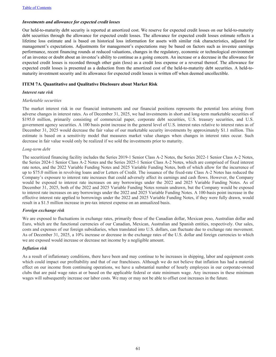 Investments and allowance for expected credit losses Our held-to-maturity debt security is reported at amortized cost. We reserve for expected credit losses on our held-to-maturity debt securities through the allowance for expected credit losses. The allowance for expected credit losses estimate reflects a lifetime loss estimate and is based on historical loss information for assets with similar risk characteristics, adjusted for management’s expectations. Adjustments for management’s expectations may be based on factors such as investee earnings performance, recent financing rounds at reduced valuations, changes in the regulatory, economic or technological environment of an investee or doubt about an investee’s ability to continue as a going concern. An increase or a decrease in the allowance for expected credit losses is recorded through other gain (loss) as a credit loss expense or a reversal thereof. The allowance for expected credit losses is presented as a deduction from the amortized cost of the held-to-maturity debt securities. A held-to- maturity investment security and its allowance for expected credit losses is written off when deemed uncollectible. ITEM 7A. Quantitative and Qualitative Disclosure about Market Risk Interest rate risk Marketable securities The market interest risk in our financial instruments and our financial positions represents the potential loss arising from adverse changes in interest rates. As of December 31, 2025, we had investments in short and long-term marketable securities of $195.0 million, primarily consisting of commercial paper, corporate debt securities, U.S. treasury securities, and U.S. government agency securities. A 100 basis point increase in the general level of U.S. interest rates relative to interest rates as of December 31, 2025 would decrease the fair value of our marketable security investments by approximately $1.1 million. This estimate is based on a sensitivity model that measures market value changes when changes in interest rates occur. Such decrease in fair value would only be realized if we sold the investments prior to maturity. Long-term debt The securitized financing facility includes the Series 2019-1 Senior Class A-2 Notes, the Series 2022-1 Senior Class A-2 Notes, the Series 2024-1 Senior Class A-2 Notes and the Series 2025-1 Senior Class A-2 Notes, which are comprised of fixed interest rate notes, and the 2022 Variable Funding Notes and 2025 Variable Funding Notes, both of which allow for the incurrence of up to $75.0 million in revolving loans and/or Letters of Credit. The issuance of the fixed-rate Class A-2 Notes has reduced the Company’s exposure to interest rate increases that could adversely affect its earnings and cash flows. However, the Company would be exposed to interest rate increases on any borrowings under the 2022 and 2025 Variable Funding Notes. As of December 31, 2025, both of the 2022 and 2025 Variable Funding Notes remain undrawn, but the Company would be exposed to interest rate increases on any borrowings under the 2022 and 2025 Variable Funding Notes. A 100-basis point increase in the effective interest rate applied to borrowings under the 2022 and 2025 Variable Funding Notes, if they were fully drawn, would result in a $1.5 million increase in pre-tax interest expense on an annualized basis. Foreign exchange risk We are exposed to fluctuations in exchange rates, primarily those of the Canadian dollar, Mexican peso, Australian dollar and Euro, which are the functional currencies of our Canadian, Mexican, Australian and Spanish entities, respectively. Our sales, costs and expenses of our foreign subsidiaries, when translated into U.S. dollars, can fluctuate due to exchange rate movement. As of December 31, 2025, a 10% increase or decrease in the exchange rates of the U.S. dollar and foreign currencies to which we are exposed would increase or decrease net income by a negligible amount. Inflation risk As a result of inflationary conditions, there have been and may continue to be increases in shipping, labor and equipment costs which could impact our profitability and that of our franchisees. Although we do not believe that inflation has had a material effect on our income from continuing operations, we have a substantial number of hourly employees in our corporate-owned clubs that are paid wage rates at or based on the applicable federal or state minimum wage. Any increases in these minimum wages will subsequently increase our labor costs. We may or may not be able to offset cost increases in the future. Table of Contents 61