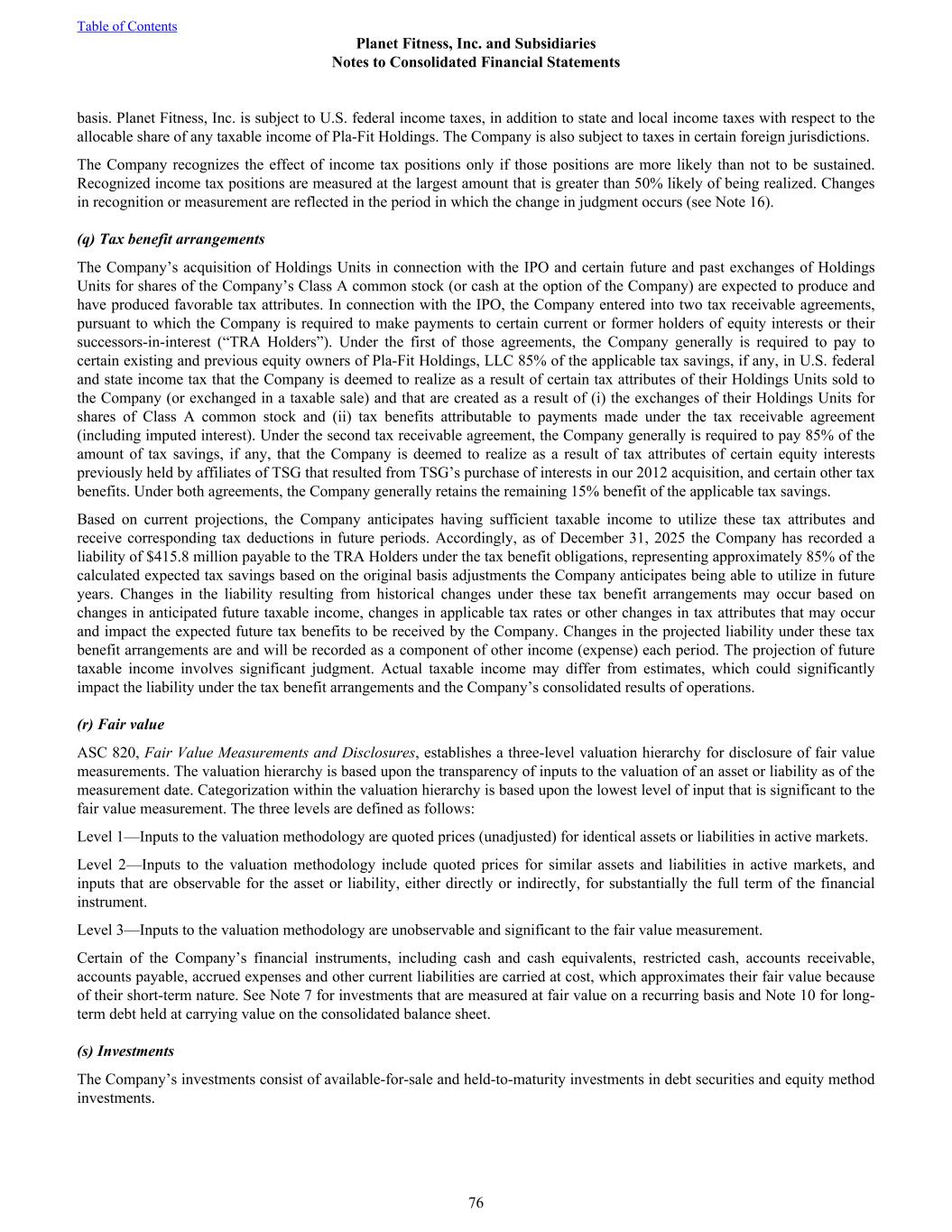 basis. Planet Fitness, Inc. is subject to U.S. federal income taxes, in addition to state and local income taxes with respect to the allocable share of any taxable income of Pla-Fit Holdings. The Company is also subject to taxes in certain foreign jurisdictions. The Company recognizes the effect of income tax positions only if those positions are more likely than not to be sustained. Recognized income tax positions are measured at the largest amount that is greater than 50% likely of being realized. Changes in recognition or measurement are reflected in the period in which the change in judgment occurs (see Note 16). (q) Tax benefit arrangements The Company’s acquisition of Holdings Units in connection with the IPO and certain future and past exchanges of Holdings Units for shares of the Company’s Class A common stock (or cash at the option of the Company) are expected to produce and have produced favorable tax attributes. In connection with the IPO, the Company entered into two tax receivable agreements, pursuant to which the Company is required to make payments to certain current or former holders of equity interests or their successors-in-interest (“TRA Holders”). Under the first of those agreements, the Company generally is required to pay to certain existing and previous equity owners of Pla-Fit Holdings, LLC 85% of the applicable tax savings, if any, in U.S. federal and state income tax that the Company is deemed to realize as a result of certain tax attributes of their Holdings Units sold to the Company (or exchanged in a taxable sale) and that are created as a result of (i) the exchanges of their Holdings Units for shares of Class A common stock and (ii) tax benefits attributable to payments made under the tax receivable agreement (including imputed interest). Under the second tax receivable agreement, the Company generally is required to pay 85% of the amount of tax savings, if any, that the Company is deemed to realize as a result of tax attributes of certain equity interests previously held by affiliates of TSG that resulted from TSG’s purchase of interests in our 2012 acquisition, and certain other tax benefits. Under both agreements, the Company generally retains the remaining 15% benefit of the applicable tax savings. Based on current projections, the Company anticipates having sufficient taxable income to utilize these tax attributes and receive corresponding tax deductions in future periods. Accordingly, as of December 31, 2025 the Company has recorded a liability of $415.8 million payable to the TRA Holders under the tax benefit obligations, representing approximately 85% of the calculated expected tax savings based on the original basis adjustments the Company anticipates being able to utilize in future years. Changes in the liability resulting from historical changes under these tax benefit arrangements may occur based on changes in anticipated future taxable income, changes in applicable tax rates or other changes in tax attributes that may occur and impact the expected future tax benefits to be received by the Company. Changes in the projected liability under these tax benefit arrangements are and will be recorded as a component of other income (expense) each period. The projection of future taxable income involves significant judgment. Actual taxable income may differ from estimates, which could significantly impact the liability under the tax benefit arrangements and the Company’s consolidated results of operations. (r) Fair value ASC 820, Fair Value Measurements and Disclosures, establishes a three-level valuation hierarchy for disclosure of fair value measurements. The valuation hierarchy is based upon the transparency of inputs to the valuation of an asset or liability as of the measurement date. Categorization within the valuation hierarchy is based upon the lowest level of input that is significant to the fair value measurement. The three levels are defined as follows: Level 1—Inputs to the valuation methodology are quoted prices (unadjusted) for identical assets or liabilities in active markets. Level 2—Inputs to the valuation methodology include quoted prices for similar assets and liabilities in active markets, and inputs that are observable for the asset or liability, either directly or indirectly, for substantially the full term of the financial instrument. Level 3—Inputs to the valuation methodology are unobservable and significant to the fair value measurement. Certain of the Company’s financial instruments, including cash and cash equivalents, restricted cash, accounts receivable, accounts payable, accrued expenses and other current liabilities are carried at cost, which approximates their fair value because of their short-term nature. See Note 7 for investments that are measured at fair value on a recurring basis and Note 10 for long- term debt held at carrying value on the consolidated balance sheet. (s) Investments The Company’s investments consist of available-for-sale and held-to-maturity investments in debt securities and equity method investments. Table of Contents Planet Fitness, Inc. and Subsidiaries Notes to Consolidated Financial Statements 76