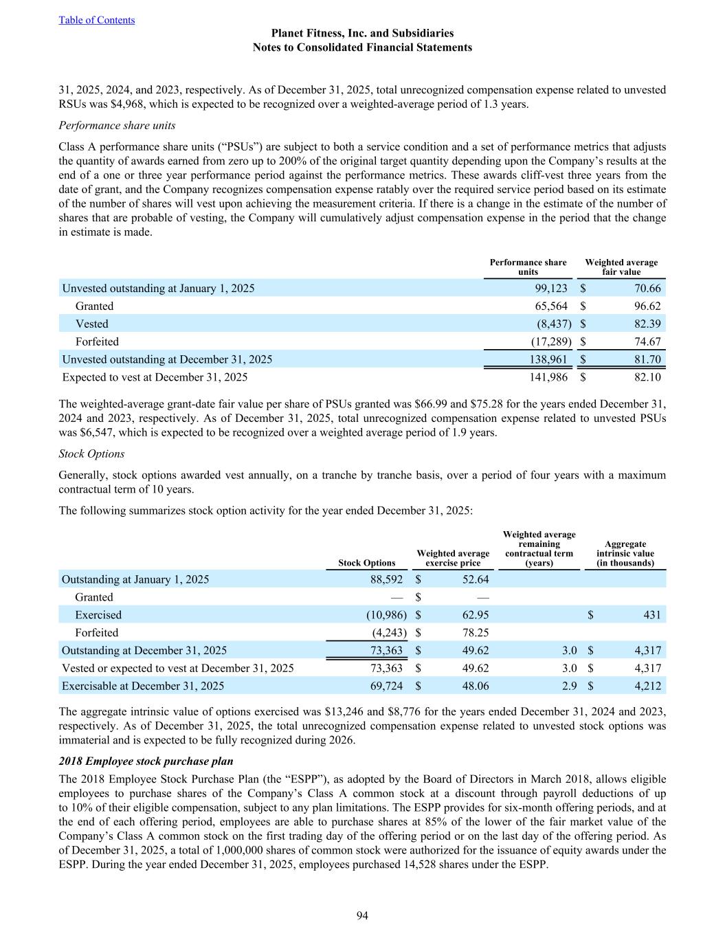 31, 2025, 2024, and 2023, respectively. As of December 31, 2025, total unrecognized compensation expense related to unvested RSUs was $4,968, which is expected to be recognized over a weighted-average period of 1.3 years. Performance share units Class A performance share units (“PSUs”) are subject to both a service condition and a set of performance metrics that adjusts the quantity of awards earned from zero up to 200% of the original target quantity depending upon the Company’s results at the end of a one or three year performance period against the performance metrics. These awards cliff-vest three years from the date of grant, and the Company recognizes compensation expense ratably over the required service period based on its estimate of the number of shares will vest upon achieving the measurement criteria. If there is a change in the estimate of the number of shares that are probable of vesting, the Company will cumulatively adjust compensation expense in the period that the change in estimate is made. Performance share units Weighted average fair value Unvested outstanding at January 1, 2025 99,123 $ 70.66 Granted 65,564 $ 96.62 Vested (8,437) $ 82.39 Forfeited (17,289) $ 74.67 Unvested outstanding at December 31, 2025 138,961 $ 81.70 Expected to vest at December 31, 2025 141,986 $ 82.10 The weighted-average grant-date fair value per share of PSUs granted was $66.99 and $75.28 for the years ended December 31, 2024 and 2023, respectively. As of December 31, 2025, total unrecognized compensation expense related to unvested PSUs was $6,547, which is expected to be recognized over a weighted average period of 1.9 years. Stock Options Generally, stock options awarded vest annually, on a tranche by tranche basis, over a period of four years with a maximum contractual term of 10 years. The following summarizes stock option activity for the year ended December 31, 2025: Stock Options Weighted average exercise price Weighted average remaining contractual term (years) Aggregate intrinsic value (in thousands) Outstanding at January 1, 2025 88,592 $ 52.64 Granted — $ — Exercised (10,986) $ 62.95 $ 431 Forfeited (4,243) $ 78.25 Outstanding at December 31, 2025 73,363 $ 49.62 3.0 $ 4,317 Vested or expected to vest at December 31, 2025 73,363 $ 49.62 3.0 $ 4,317 Exercisable at December 31, 2025 69,724 $ 48.06 2.9 $ 4,212 The aggregate intrinsic value of options exercised was $13,246 and $8,776 for the years ended December 31, 2024 and 2023, respectively. As of December 31, 2025, the total unrecognized compensation expense related to unvested stock options was immaterial and is expected to be fully recognized during 2026. 2018 Employee stock purchase plan The 2018 Employee Stock Purchase Plan (the “ESPP”), as adopted by the Board of Directors in March 2018, allows eligible employees to purchase shares of the Company’s Class A common stock at a discount through payroll deductions of up to 10% of their eligible compensation, subject to any plan limitations. The ESPP provides for six-month offering periods, and at the end of each offering period, employees are able to purchase shares at 85% of the lower of the fair market value of the Company’s Class A common stock on the first trading day of the offering period or on the last day of the offering period. As of December 31, 2025, a total of 1,000,000 shares of common stock were authorized for the issuance of equity awards under the ESPP. During the year ended December 31, 2025, employees purchased 14,528 shares under the ESPP. Table of Contents Planet Fitness, Inc. and Subsidiaries Notes to Consolidated Financial Statements 94