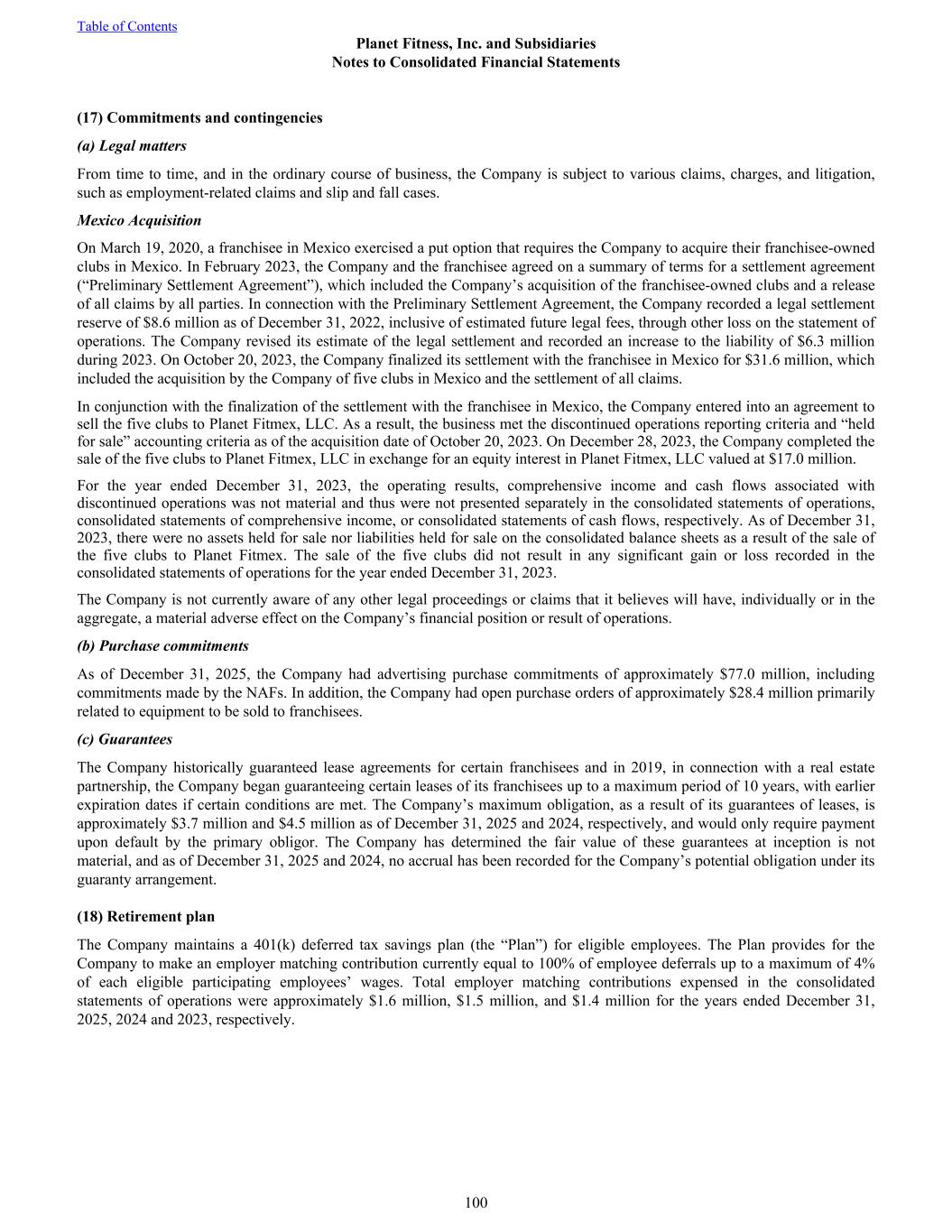 (17) Commitments and contingencies (a) Legal matters From time to time, and in the ordinary course of business, the Company is subject to various claims, charges, and litigation, such as employment-related claims and slip and fall cases. Mexico Acquisition On March 19, 2020, a franchisee in Mexico exercised a put option that requires the Company to acquire their franchisee-owned clubs in Mexico. In February 2023, the Company and the franchisee agreed on a summary of terms for a settlement agreement (“Preliminary Settlement Agreement”), which included the Company’s acquisition of the franchisee-owned clubs and a release of all claims by all parties. In connection with the Preliminary Settlement Agreement, the Company recorded a legal settlement reserve of $8.6 million as of December 31, 2022, inclusive of estimated future legal fees, through other loss on the statement of operations. The Company revised its estimate of the legal settlement and recorded an increase to the liability of $6.3 million during 2023. On October 20, 2023, the Company finalized its settlement with the franchisee in Mexico for $31.6 million, which included the acquisition by the Company of five clubs in Mexico and the settlement of all claims. In conjunction with the finalization of the settlement with the franchisee in Mexico, the Company entered into an agreement to sell the five clubs to Planet Fitmex, LLC. As a result, the business met the discontinued operations reporting criteria and “held for sale” accounting criteria as of the acquisition date of October 20, 2023. On December 28, 2023, the Company completed the sale of the five clubs to Planet Fitmex, LLC in exchange for an equity interest in Planet Fitmex, LLC valued at $17.0 million. For the year ended December 31, 2023, the operating results, comprehensive income and cash flows associated with discontinued operations was not material and thus were not presented separately in the consolidated statements of operations, consolidated statements of comprehensive income, or consolidated statements of cash flows, respectively. As of December 31, 2023, there were no assets held for sale nor liabilities held for sale on the consolidated balance sheets as a result of the sale of the five clubs to Planet Fitmex. The sale of the five clubs did not result in any significant gain or loss recorded in the consolidated statements of operations for the year ended December 31, 2023. The Company is not currently aware of any other legal proceedings or claims that it believes will have, individually or in the aggregate, a material adverse effect on the Company’s financial position or result of operations. (b) Purchase commitments As of December 31, 2025, the Company had advertising purchase commitments of approximately $77.0 million, including commitments made by the NAFs. In addition, the Company had open purchase orders of approximately $28.4 million primarily related to equipment to be sold to franchisees. (c) Guarantees The Company historically guaranteed lease agreements for certain franchisees and in 2019, in connection with a real estate partnership, the Company began guaranteeing certain leases of its franchisees up to a maximum period of 10 years, with earlier expiration dates if certain conditions are met. The Company’s maximum obligation, as a result of its guarantees of leases, is approximately $3.7 million and $4.5 million as of December 31, 2025 and 2024, respectively, and would only require payment upon default by the primary obligor. The Company has determined the fair value of these guarantees at inception is not material, and as of December 31, 2025 and 2024, no accrual has been recorded for the Company’s potential obligation under its guaranty arrangement. (18) Retirement plan The Company maintains a 401(k) deferred tax savings plan (the “Plan”) for eligible employees. The Plan provides for the Company to make an employer matching contribution currently equal to 100% of employee deferrals up to a maximum of 4% of each eligible participating employees’ wages. Total employer matching contributions expensed in the consolidated statements of operations were approximately $1.6 million, $1.5 million, and $1.4 million for the years ended December 31, 2025, 2024 and 2023, respectively. Table of Contents Planet Fitness, Inc. and Subsidiaries Notes to Consolidated Financial Statements 100