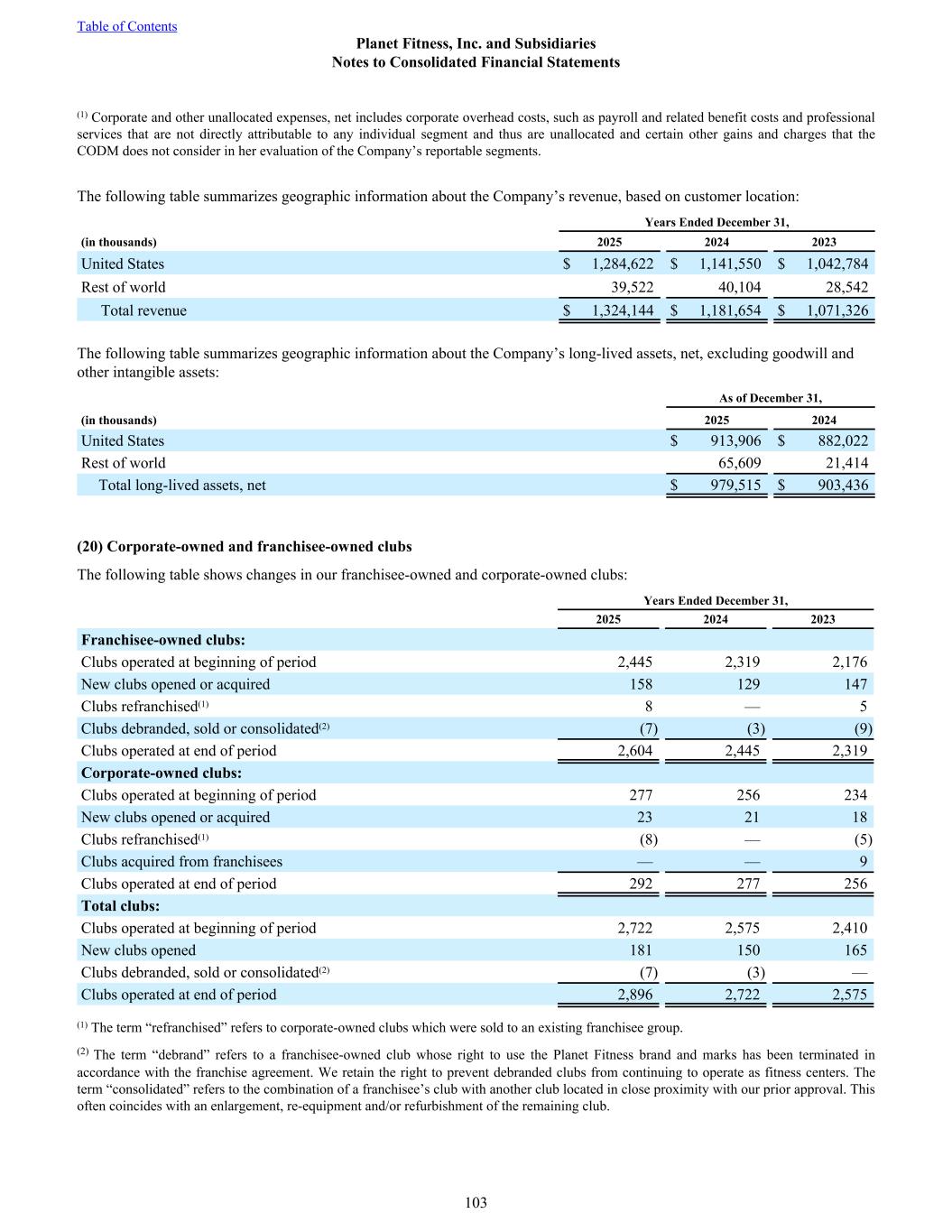 (1) Corporate and other unallocated expenses, net includes corporate overhead costs, such as payroll and related benefit costs and professional services that are not directly attributable to any individual segment and thus are unallocated and certain other gains and charges that the CODM does not consider in her evaluation of the Company’s reportable segments. The following table summarizes geographic information about the Company’s revenue, based on customer location: Years Ended December 31, (in thousands) 2025 2024 2023 United States $ 1,284,622 $ 1,141,550 $ 1,042,784 Rest of world 39,522 40,104 28,542 Total revenue $ 1,324,144 $ 1,181,654 $ 1,071,326 The following table summarizes geographic information about the Company’s long-lived assets, net, excluding goodwill and other intangible assets: As of December 31, (in thousands) 2025 2024 United States $ 913,906 $ 882,022 Rest of world 65,609 21,414 Total long-lived assets, net $ 979,515 $ 903,436 (20) Corporate-owned and franchisee-owned clubs The following table shows changes in our franchisee-owned and corporate-owned clubs: Years Ended December 31, 2025 2024 2023 Franchisee-owned clubs: Clubs operated at beginning of period 2,445 2,319 2,176 New clubs opened or acquired 158 129 147 Clubs refranchised(1) 8 — 5 Clubs debranded, sold or consolidated(2) (7) (3) (9) Clubs operated at end of period 2,604 2,445 2,319 Corporate-owned clubs: Clubs operated at beginning of period 277 256 234 New clubs opened or acquired 23 21 18 Clubs refranchised(1) (8) — (5) Clubs acquired from franchisees — — 9 Clubs operated at end of period 292 277 256 Total clubs: Clubs operated at beginning of period 2,722 2,575 2,410 New clubs opened 181 150 165 Clubs debranded, sold or consolidated(2) (7) (3) — Clubs operated at end of period 2,896 2,722 2,575 (1) The term “refranchised” refers to corporate-owned clubs which were sold to an existing franchisee group. (2) The term “debrand” refers to a franchisee-owned club whose right to use the Planet Fitness brand and marks has been terminated in accordance with the franchise agreement. We retain the right to prevent debranded clubs from continuing to operate as fitness centers. The term “consolidated” refers to the combination of a franchisee’s club with another club located in close proximity with our prior approval. This often coincides with an enlargement, re-equipment and/or refurbishment of the remaining club. Table of Contents Planet Fitness, Inc. and Subsidiaries Notes to Consolidated Financial Statements 103