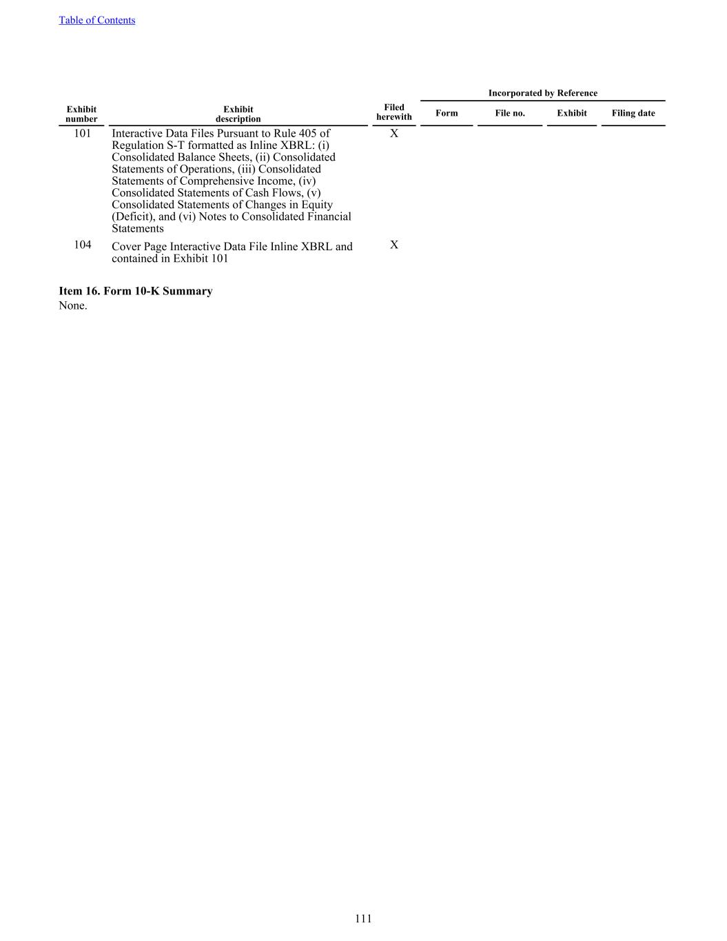 101 Interactive Data Files Pursuant to Rule 405 of Regulation S-T formatted as Inline XBRL: (i) Consolidated Balance Sheets, (ii) Consolidated Statements of Operations, (iii) Consolidated Statements of Comprehensive Income, (iv) Consolidated Statements of Cash Flows, (v) Consolidated Statements of Changes in Equity (Deficit), and (vi) Notes to Consolidated Financial Statements X 104 Cover Page Interactive Data File Inline XBRL and contained in Exhibit 101 X Incorporated by Reference Exhibit number Exhibit description Filed herewith Form File no. Exhibit Filing date Item 16. Form 10-K Summary None. Table of Contents 111