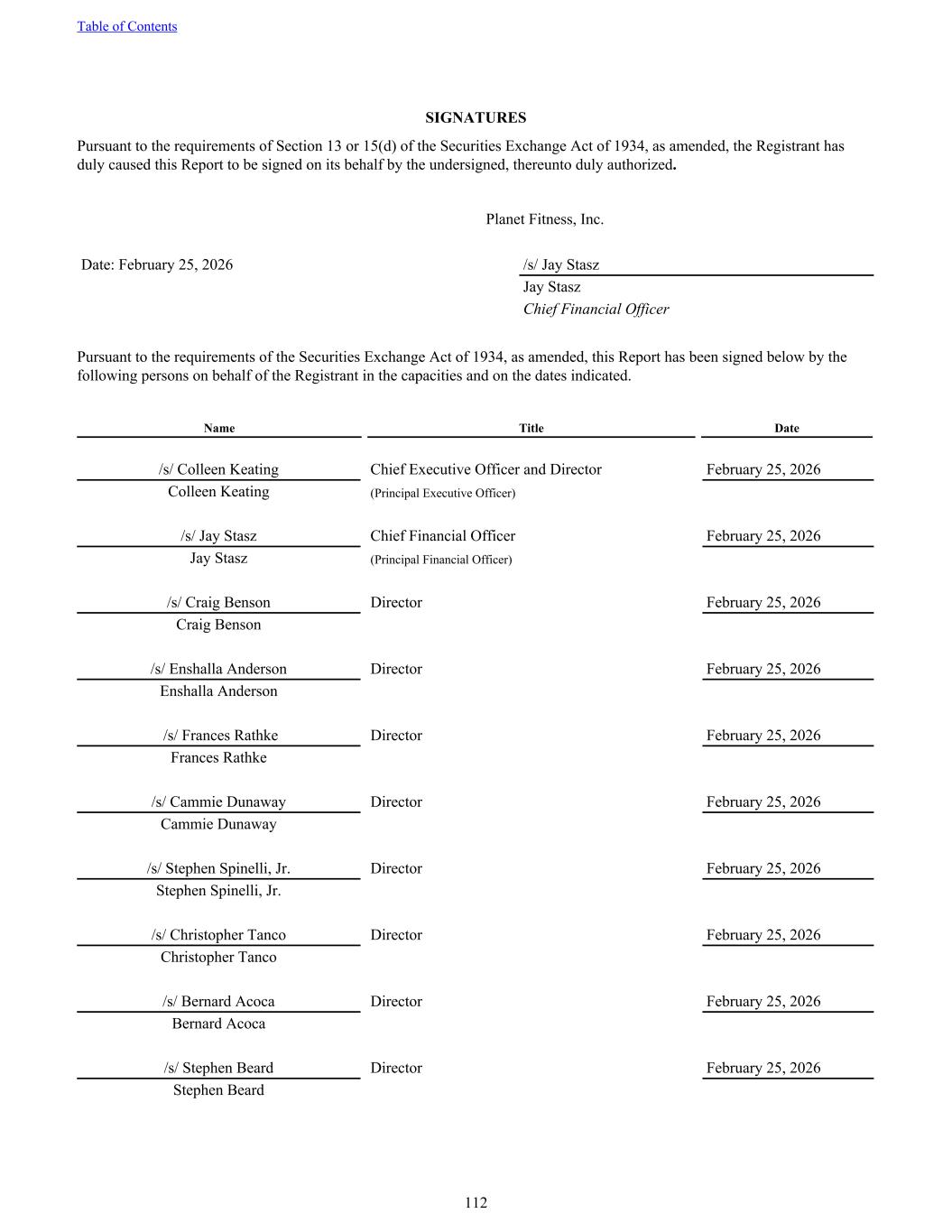 SIGNATURES Pursuant to the requirements of Section 13 or 15(d) of the Securities Exchange Act of 1934, as amended, the Registrant has duly caused this Report to be signed on its behalf by the undersigned, thereunto duly authorized. Planet Fitness, Inc. Date: February 25, 2026 /s/ Jay Stasz Jay Stasz Chief Financial Officer Pursuant to the requirements of the Securities Exchange Act of 1934, as amended, this Report has been signed below by the following persons on behalf of the Registrant in the capacities and on the dates indicated. Name Title Date /s/ Colleen Keating Chief Executive Officer and Director February 25, 2026 Colleen Keating (Principal Executive Officer) /s/ Jay Stasz Chief Financial Officer February 25, 2026 Jay Stasz (Principal Financial Officer) /s/ Craig Benson Director February 25, 2026 Craig Benson /s/ Enshalla Anderson Director February 25, 2026 Enshalla Anderson /s/ Frances Rathke Director February 25, 2026 Frances Rathke /s/ Cammie Dunaway Director February 25, 2026 Cammie Dunaway /s/ Stephen Spinelli, Jr. Director February 25, 2026 Stephen Spinelli, Jr. /s/ Christopher Tanco Director February 25, 2026 Christopher Tanco /s/ Bernard Acoca Director February 25, 2026 Bernard Acoca /s/ Stephen Beard Director February 25, 2026 Stephen Beard Table of Contents 112