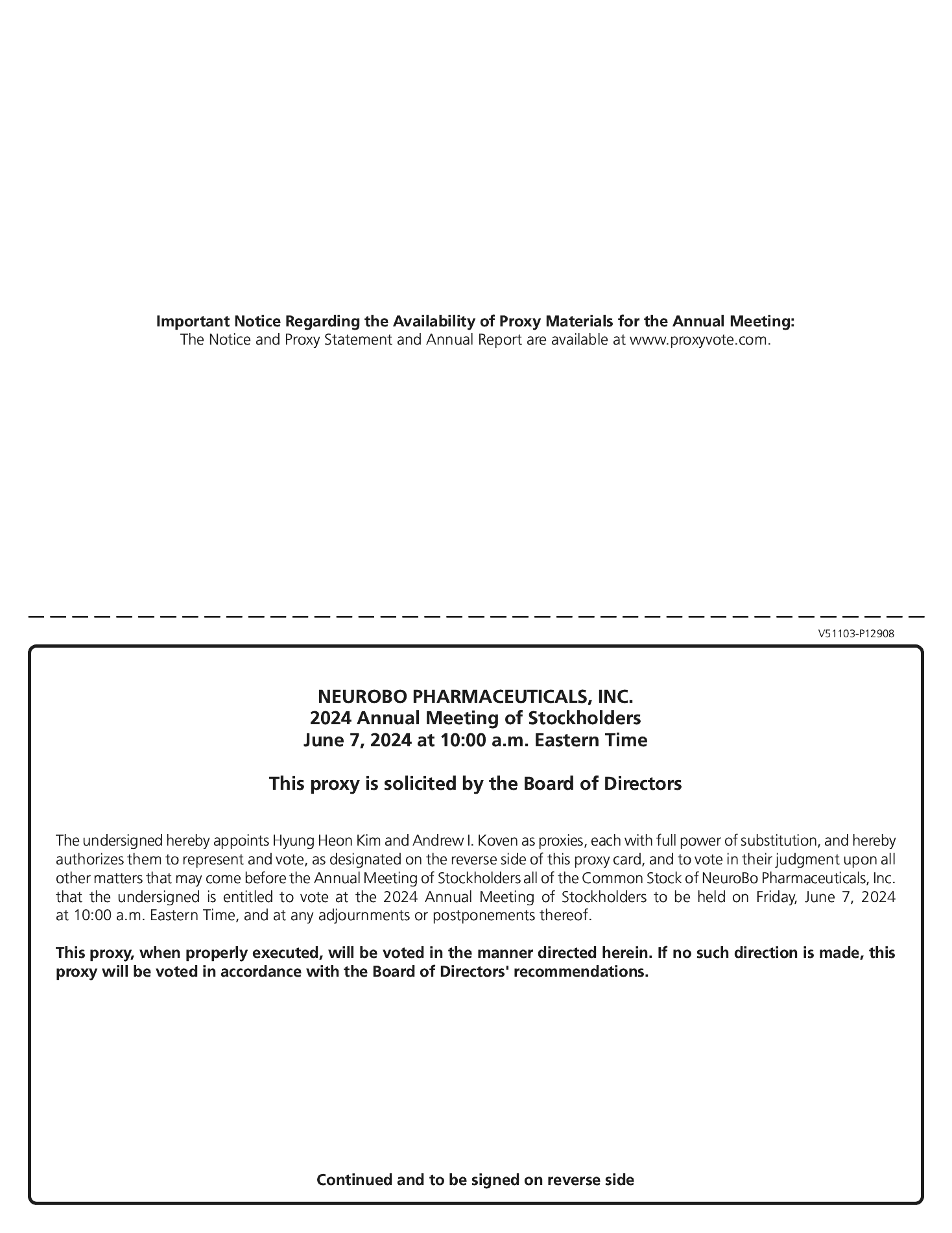 | • | Vote by mail - complete, sign and date the accompanying proxy card and return it as soon as possible before the Annual Meeting in the envelope provided. If the postage-paid envelope is missing, please mail your completed proxy card to the attention of our Secretary, NeuroBo Pharmaceuticals, Inc., 545 Concord Avenue, Suite 210, Cambridge, Massachusetts 02138.  |