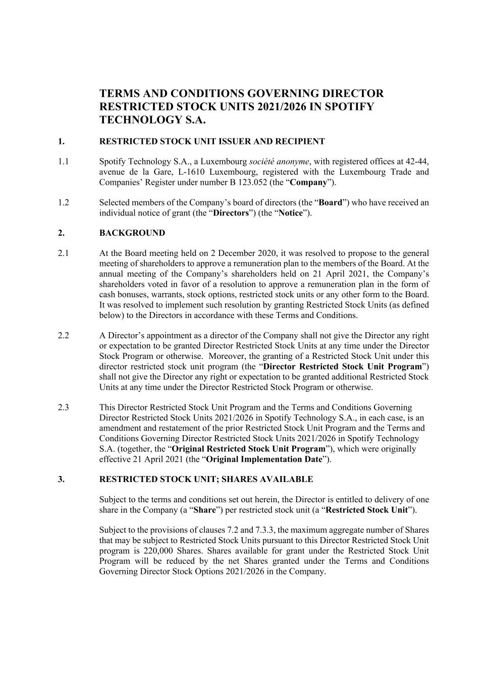 TERMS AND CONDITIONS GOVERNING DIRECTOR RESTRICTED STOCK UNITS 2021/2026 IN SPOTIFY TECHNOLOGY S.A. 1. RESTRICTED STOCK UNIT ISSUER AND RECIPIENT 1.1 Spotify Technology S.A., a Luxembourg société anonyme, with registered offices at 42-44, avenue de la Gare, L-1610 Luxembourg, registered with the Luxembourg Trade and Companies’ Register under number B 123.052 (the “Company”). 1.2 Selected members of the Company’s board of directors (the “Board”) who have received an individual notice of grant (the “Directors”) (the “Notice”). 2. BACKGROUND 2.1 At the Board meeting held on 2 December 2020, it was resolved to propose to the general meeting of shareholders to approve a remuneration plan to the members of the Board. At the annual meeting of the Company’s shareholders held on 21 April 2021, the Company’s shareholders voted in favor of a resolution to approve a remuneration plan in the form of cash bonuses, warrants, stock options, restricted stock units or any other form to the Board. It was resolved to implement such resolution by granting Restricted Stock Units (as defined below) to the Directors in accordance with these Terms and Conditions. 2.2 A Director’s appointment as a director of the Company shall not give the Director any right or expectation to be granted Director Restricted Stock Units at any time under the Director Stock Program or otherwise. Moreover, the granting of a Restricted Stock Unit under this director restricted stock unit program (the “Director Restricted Stock Unit Program”) shall not give the Director any right or expectation to be granted additional Restricted Stock Units at any time under the Director Restricted Stock Program or otherwise. 2.3 This Director Restricted Stock Unit Program and the Terms and Conditions Governing Director Restricted Stock Units 2021/2026 in Spotify Technology S.A., in each case, is an amendment and restatement of the prior Restricted Stock Unit Program and the Terms and Conditions Governing Director Restricted Stock Units 2021/2026 in Spotify Technology S.A. (together, the “Original Restricted Stock Unit Program”), which were originally effective 21 April 2021 (the “Original Implementation Date”). 3. RESTRICTED STOCK UNIT; SHARES AVAILABLE Subject to the terms and conditions set out herein, the Director is entitled to delivery of one share in the Company (a “Share”) per restricted stock unit (a “Restricted Stock Unit”). Subject to the provisions of clauses 7.2 and 7.3.3, the maximum aggregate number of Shares that may be subject to Restricted Stock Units pursuant to this Director Restricted Stock Unit program is 220,000 Shares. Shares available for grant under the Restricted Stock Unit Program will be reduced by the net Shares granted under the Terms and Conditions Governing Director Stock Options 2021/2026 in the Company.