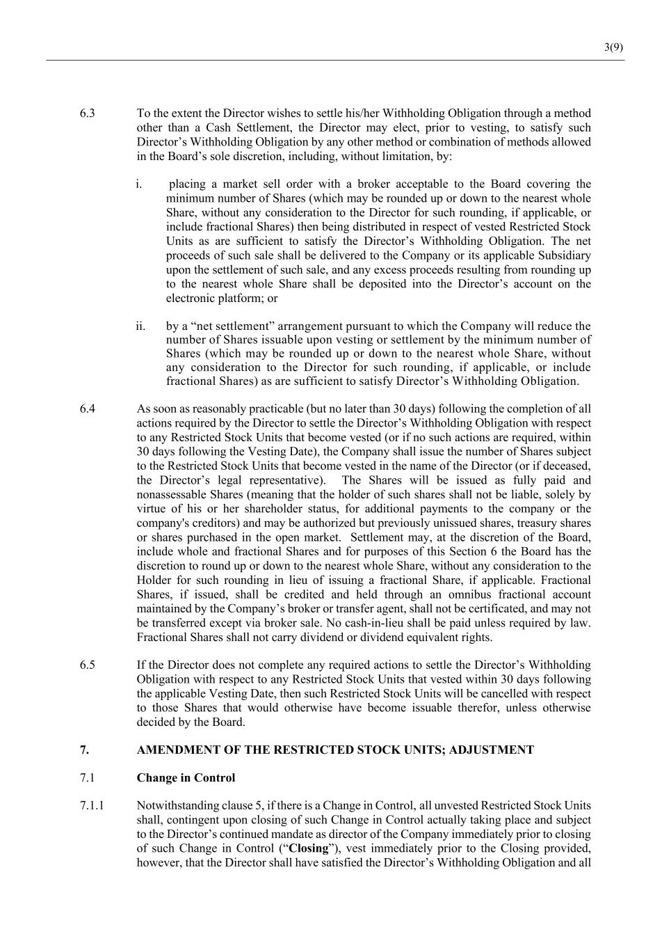 3(9) 6.3 To the extent the Director wishes to settle his/her Withholding Obligation through a method other than a Cash Settlement, the Director may elect, prior to vesting, to satisfy such Director’s Withholding Obligation by any other method or combination of methods allowed in the Board’s sole discretion, including, without limitation, by: i. placing a market sell order with a broker acceptable to the Board covering the minimum number of Shares (which may be rounded up or down to the nearest whole Share, without any consideration to the Director for such rounding, if applicable, or include fractional Shares) then being distributed in respect of vested Restricted Stock Units as are sufficient to satisfy the Director’s Withholding Obligation. The net proceeds of such sale shall be delivered to the Company or its applicable Subsidiary upon the settlement of such sale, and any excess proceeds resulting from rounding up to the nearest whole Share shall be deposited into the Director’s account on the electronic platform; or ii. by a “net settlement” arrangement pursuant to which the Company will reduce the number of Shares issuable upon vesting or settlement by the minimum number of Shares (which may be rounded up or down to the nearest whole Share, without any consideration to the Director for such rounding, if applicable, or include fractional Shares) as are sufficient to satisfy Director’s Withholding Obligation. 6.4 As soon as reasonably practicable (but no later than 30 days) following the completion of all actions required by the Director to settle the Director’s Withholding Obligation with respect to any Restricted Stock Units that become vested (or if no such actions are required, within 30 days following the Vesting Date), the Company shall issue the number of Shares subject to the Restricted Stock Units that become vested in the name of the Director (or if deceased, the Director’s legal representative). The Shares will be issued as fully paid and nonassessable Shares (meaning that the holder of such shares shall not be liable, solely by virtue of his or her shareholder status, for additional payments to the company or the company's creditors) and may be authorized but previously unissued shares, treasury shares or shares purchased in the open market. Settlement may, at the discretion of the Board, include whole and fractional Shares and for purposes of this Section 6 the Board has the discretion to round up or down to the nearest whole Share, without any consideration to the Holder for such rounding in lieu of issuing a fractional Share, if applicable. Fractional Shares, if issued, shall be credited and held through an omnibus fractional account maintained by the Company’s broker or transfer agent, shall not be certificated, and may not be transferred except via broker sale. No cash-in-lieu shall be paid unless required by law. Fractional Shares shall not carry dividend or dividend equivalent rights. 6.5 If the Director does not complete any required actions to settle the Director’s Withholding Obligation with respect to any Restricted Stock Units that vested within 30 days following the applicable Vesting Date, then such Restricted Stock Units will be cancelled with respect to those Shares that would otherwise have become issuable therefor, unless otherwise decided by the Board. 7. AMENDMENT OF THE RESTRICTED STOCK UNITS; ADJUSTMENT 7.1 Change in Control 7.1.1 Notwithstanding clause 5, if there is a Change in Control, all unvested Restricted Stock Units shall, contingent upon closing of such Change in Control actually taking place and subject to the Director’s continued mandate as director of the Company immediately prior to closing of such Change in Control (“Closing”), vest immediately prior to the Closing provided, however, that the Director shall have satisfied the Director’s Withholding Obligation and all