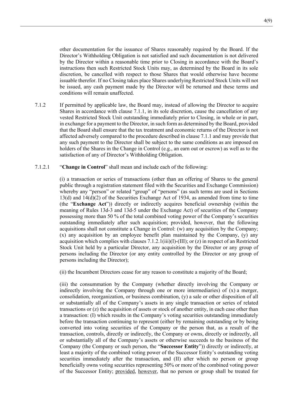 4(9) other documentation for the issuance of Shares reasonably required by the Board. If the Director’s Withholding Obligation is not satisfied and such documentation is not delivered by the Director within a reasonable time prior to Closing in accordance with the Board’s instructions then such Restricted Stock Units may, as determined by the Board in its sole discretion, be cancelled with respect to those Shares that would otherwise have become issuable therefor. If no Closing takes place Shares underlying Restricted Stock Units will not be issued, any cash payment made by the Director will be returned and these terms and conditions will remain unaffected. 7.1.2 If permitted by applicable law, the Board may, instead of allowing the Director to acquire Shares in accordance with clause 7.1.1, in its sole discretion, cause the cancellation of any vested Restricted Stock Unit outstanding immediately prior to Closing, in whole or in part, in exchange for a payment to the Director, in such form as determined by the Board, provided that the Board shall ensure that the tax treatment and economic returns of the Director is not affected adversely compared to the procedure described in clause 7.1.1 and may provide that any such payment to the Director shall be subject to the same conditions as are imposed on holders of the Shares in the Change in Control (e.g., an earn out or escrow) as well as to the satisfaction of any of Director’s Withholding Obligation. 7.1.2.1 “Change in Control” shall mean and include each of the following: (i) a transaction or series of transactions (other than an offering of Shares to the general public through a registration statement filed with the Securities and Exchange Commission) whereby any “person” or related “group” of “persons” (as such terms are used in Sections 13(d) and 14(d)(2) of the Securities Exchange Act of 1934, as amended from time to time (the “Exchange Act”)) directly or indirectly acquires beneficial ownership (within the meaning of Rules 13d-3 and 13d-5 under the Exchange Act) of securities of the Company possessing more than 50 % of the total combined voting power of the Company’s securities outstanding immediately after such acquisition; provided, however, that the following acquisitions shall not constitute a Change in Control: (w) any acquisition by the Company; (x) any acquisition by an employee benefit plan maintained by the Company, (y) any acquisition which complies with clauses 7.1.2.1(iii)(I)-(III); or (z) in respect of an Restricted Stock Unit held by a particular Director, any acquisition by the Director or any group of persons including the Director (or any entity controlled by the Director or any group of persons including the Director); (ii) the Incumbent Directors cease for any reason to constitute a majority of the Board; (iii) the consummation by the Company (whether directly involving the Company or indirectly involving the Company through one or more intermediaries) of (x) a merger, consolidation, reorganization, or business combination, (y) a sale or other disposition of all or substantially all of the Company’s assets in any single transaction or series of related transactions or (z) the acquisition of assets or stock of another entity, in each case other than a transaction: (I) which results in the Company’s voting securities outstanding immediately before the transaction continuing to represent (either by remaining outstanding or by being converted into voting securities of the Company or the person that, as a result of the transaction, controls, directly or indirectly, the Company or owns, directly or indirectly, all or substantially all of the Company’s assets or otherwise succeeds to the business of the Company (the Company or such person, the “Successor Entity”)) directly or indirectly, at least a majority of the combined voting power of the Successor Entity’s outstanding voting securities immediately after the transaction, and (II) after which no person or group beneficially owns voting securities representing 50% or more of the combined voting power of the Successor Entity; provided, however, that no person or group shall be treated for